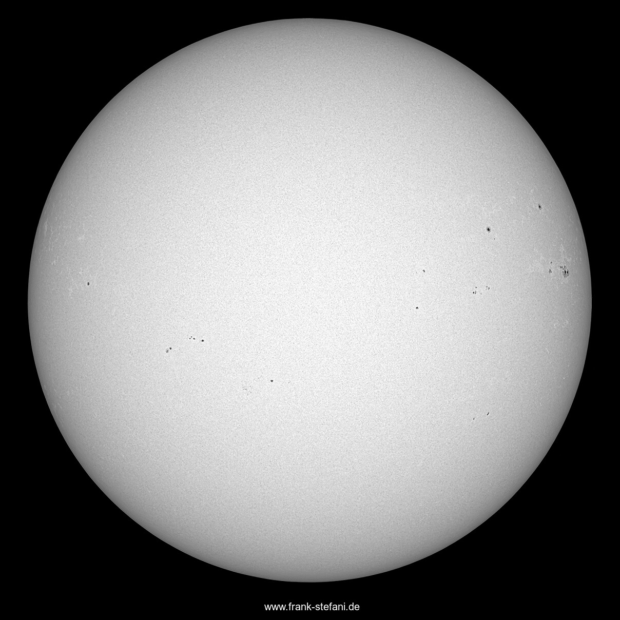 Nachdem sich vor wenigen Tage südlich des Sonnenäquators die beiden aktiven Regionen AR 14179 und AR14180 am Westrand (links) entwickelt hatten, sah es zunächst so aus, als würde sich nun eine Phase größerer Aktivität - und damit auch mehr im visuellen Spektrum des Lichtes sichtbare Sonnenflecken - zeigen. Dass dem nicht so ist, zeigt der aktuell kleine Sonnenfleck links (westlich) am Äquator, der zu der zweifelsfrei auf der nördlichen Hemisphäre liegenden AR14182 gehört - wie das passende Magnetogramm zeigt: » https://solarmonitor.org/data/2025/08/15/pngs/shmi/shmi_maglc_fd_20250815_135844.png « Es bleibt also abzuwarten, ob sich die nächsten zu erwartenden aktiven Regionen wieder weiter nördlich ausbilden, wie es in den letzten Wochen der Fall gewesen ist.
