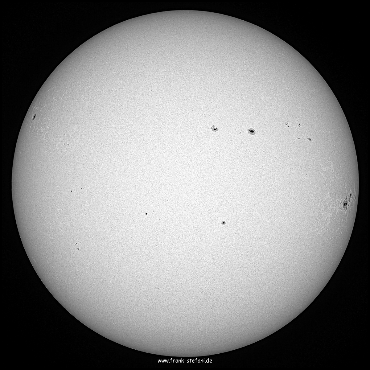 Endlich wieder Lichtblicke am Himmel: Zum Einen, weil man zwischen Schleierwolken, Kondensstreifen und einzelnen Haufenwolken blauen Himmel und einen freien Blick auf die Sonne genießen kann. Zum Anderen, weil die im visuellen Spektrum sichtbaren Aktivitäten der Sonne seit einigen Tagen deutlich zugenommen haben: Es gibt große, kleine und winzige Flecke, meist mit ausgeprägter Penumbra und tief schwarzer Umbra. Dazu ausgedehnte Fackelgebiete, die sich im für unsere Augen sichtbaren Licht naturgemäß eher zu den Rändern der Sonnenscheibe hin beobachten lassen. Wieder einmal sind diese Erscheinungen in zwei ungefähr parallel liegenden Zonen nördlich und südlich des Sonnenäquators zu sehen. Die unregelmäßig geformten größeren Flecke oben mittig und rechts nahe dem Rande der Sonnenscheibe zeigen schöne Lichtbrücken, die sich bei hoher Vergrößerung zu beobachten lohnen.