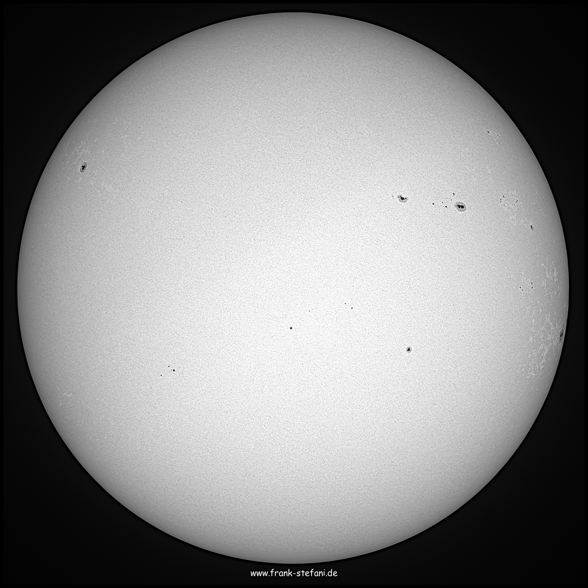 Trotz sehr ausgedehnter Schleierwolken (lat. cirrus) ist das Seeing heute relativ gut, deutlich besser als gestern (siehe: https://www.spektrum.de/alias/wunder-des-weltalls/die-sonne-am-15-februar-2024-lichtblicke-im-visuellen-spektrum/2207512). Einmal mehr fällt mir auf, wie sehr sich innerhalb eines Tages der Anblick der Sonne im visuellen Spektrum verändern kann: Heute fallen vor allem die ausgedehnten Fackelgebiete nahe des rechten Sonnenrandes auf - gespickt mit zahlreichen winzigen Sonnenflecken - während die gleichen Breitengrade der Äquatorialregion in der Nähe des linken (westlichen) Sonnenrandes nahezu glatt erscheinen. Ich liebe den Himmel - und der Himmel liebt mich.