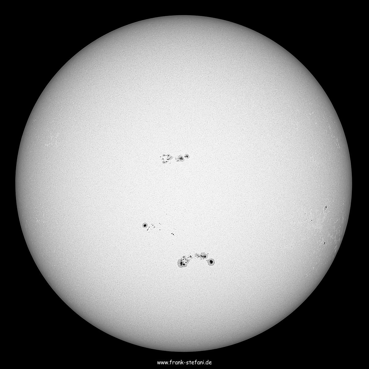 Auf den ersten Blick hat sich seit gestern (16. Juni 2024) im visuellen Spektrum nicht viel getan: Es scheint, dass sich die Sonne und damit auch alle Sonnenflecke einfach nur etwas weiter von West nach Ost gedreht hat - siehe: https://www.spektrum.de/alias/wunder-des-weltalls/die-sonne-am-16-juni-2024-praechtige-ar-13712/2219805 Vergleicht man aber die beiden aktiven Regionen AR13716 auf der nördlichen Hemisphäre (oben) und AR13712 auf der südlichen Hemisphäre (unten) im Detail mit dem Bild vom Vortag, das nur ca. 20 Stunden früher entstand, zeigen sich teils deutliche Veränderungen: Alle Umbrae (Kernschatten, tief schwarz) der beiden Regionen haben sich vergrößert und auch die sie umgebenden Penumbrae (Halbschatten, grau) sind dichter und voller geworden. Zudem zeigen sich zahlreiche neue kleine Flecke in der äquatornah gelegenen Aktiven Region AR13713 (mittig), die schon am Vortag einen auffallend gleichmäßig runden Hauptfleck samt ebenso gleichmäßiger Penumbra besaß. Es wäre interessant zu erkunden, ob und in wie weit das Entstehen und Ausbilden der Flecke einer aktiven Region von ihrer Lage auf einer der Hemisphären oder am Sonnenäquator abhängt. Das gestrige und das heutige Erscheinungsbild der drei genannten ARs legen ein "Muster" nahe, zumal abseits dieser relevanten Regionen zumindest im visuellen Spektrum völlige Ruhe zu herrschen scheint. Tipp: Dieses und das oben verlinkte Bild vom Vortag in voller Größe vergleichen!