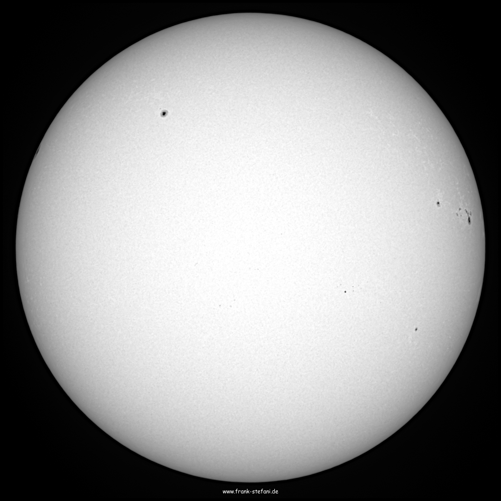Auf den ersten Blick sieht die Sonne im visuellen Spektrum nun wieder ziemlich ereignislos aus. Am rechten (östlichen) Rand verschwinden die in letzter Zeit spannend zu beobachtenden Flecke der aktiven Regionen AR 3582 und AR 3583, die in sehr ausgedehnte und weit mäandernde Fackelgebiete eingelagert sind. Links der Bildmitte und deutlich weiter nördlich liegt einsam und schön ein nahezu rund geformter Sonnenfleck der AR 3586, den eine sehr schöne Penumbra umgibt. Fast könnte man meinen, das sei alles, was man gerade auf der Westseite der Sonne beobachten könnte. Aber halt! Genau hinschauen: Etwas unterhalb von AR 3586 und genau am westlichen Sonnenrand taucht bereits ein deutlich größeren Fleck mit sehr ausgeprägter Penumbra auf, der noch keiner aktiven Region (AR) zugeordnet ist. An diesem Fleck könnte man mit besserer Auflösung und höherer Vergrößerung in den nächsten ein bis zwei Tagen vermutlich ziemlich gut den Wilson-Effekt beobachten oder fotografieren. Dabei handelt es sich um eine Schrägdraufsicht, die den Übergang von Penumbra zu Umbra geradezu dreidimensional zeigt - unbedingt sehenswert! Ich liebe den Himmel - und der Himmel liebt mich.