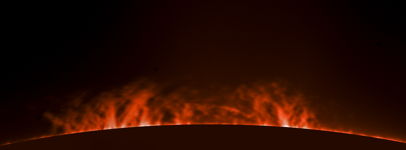 Leider war der grandiose Flare, der sich gegen 6 Uhr UT am linken Sonnenrand (bei 8 Uhr) ereignete, gegen 9 Uhr MESZ schon verschwunden. Die breite, aber ziemlich flache Protuberanz (bei 10 Uhr) tauchte erst am Nachmittag auf.