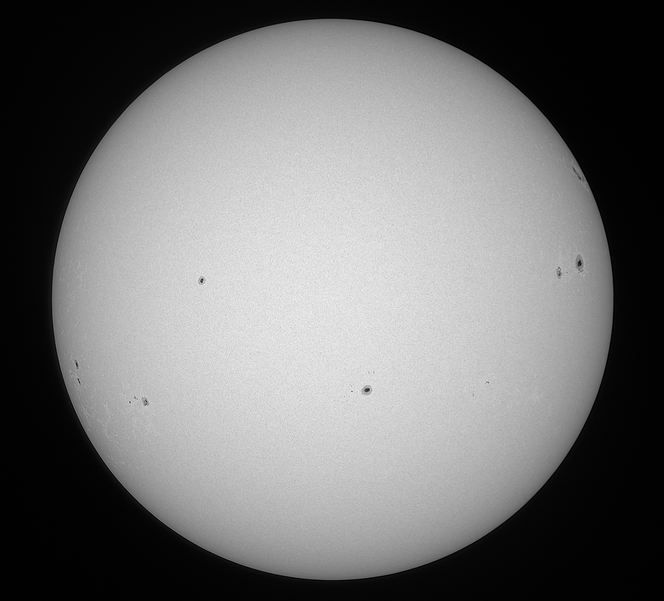 Im Weißlicht kommt keine Langeweile auf und Nachschub von Osten her ist bereits in Sicht! Am Abend / in der Nacht gab es aufgrund vorheriger Aktivität anhaltende Polarlichter über Norddeutschland und auch südlicher. Benutzt wurde ein Spektiv Leica APO-TELEVID 82 mit Winkeleinblick (Objektivdurchmesser 82 mm). Die Projektion geschah mit einem Zoomokular plus dem Leica Digiscoping-Objektiv 35. Die eingestellte Vergrößerung am Zoomokular betrug rund 35-fach. Die resultierende Endbrennweite beträgt damit etwa 1200 mm. Objektivseitig nutzte ich einen Baader Solar Folienfilter (Dichte 5) in euro-EMC Halterung (der Filter ist hier auswechselbar).