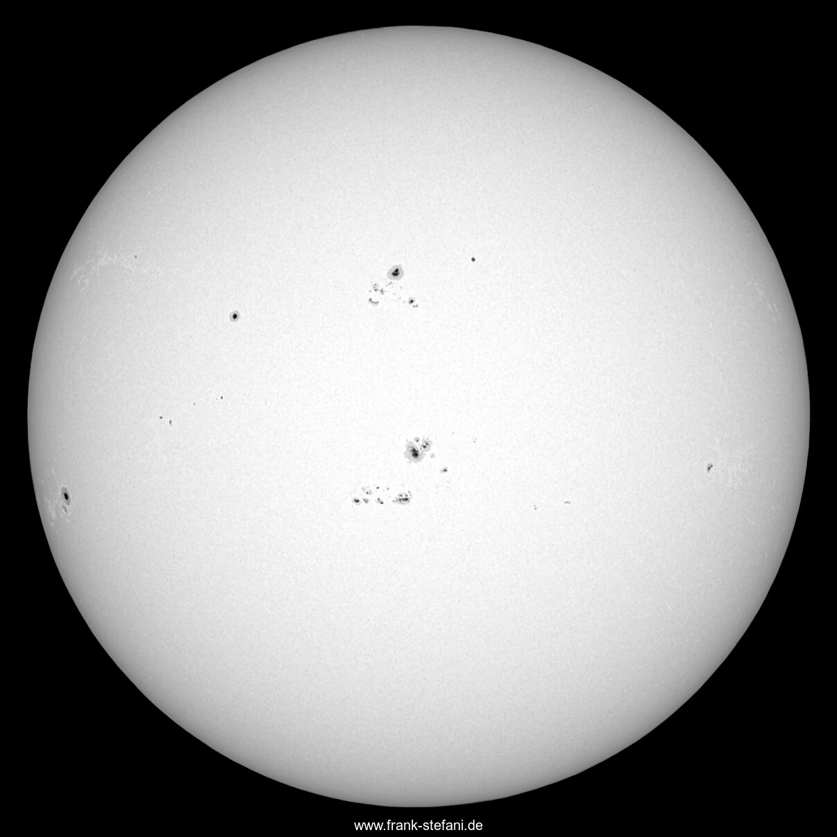 In der Mitte der Sonnenscheibe zeigen sich nördlich und südlich ihres Äquators zwei auffallend ähnliche Fleckengruppen. Nördlich der aktiven Regionen AR 14342 und südlich im Wesentlichen der AR 14345 zugehörig: Jeweils ein größerer Fleck mit schöner Penumbra, sowie darunter zahlreiche chaotisch verstreute kleiner Flecke. Bei so viel Ähnlichkeit drängte es mich, sogleich das zugehörige Magnetogramm » https://solarmonitor.org/data/2026/01/20/pngs/shmi/shmi_maglc_fd_20260120_185829.png « zu begutachten. Wie zu erwarten war, sind die magnetischen Pole beiderseits des Sonnenäquators gegensätzlich angeordnet: Wo nördlich ein Pluspol (weiß) erscheint, befindet südlich ein Minuspol (schwarz) - schwarz und weiß sind sozusagen vertausch! Bei isolierteren Fleckengruppen - beispielsweise ganz links am Westrand der Sonne in der AR 14349 - sieht man das deutlich ausgeprägt, während anscheinend die Nachbarschaft und Ähnlichkeit der zentralen Fleckengruppen ein indifferentes Erscheinungsbild zeigen.