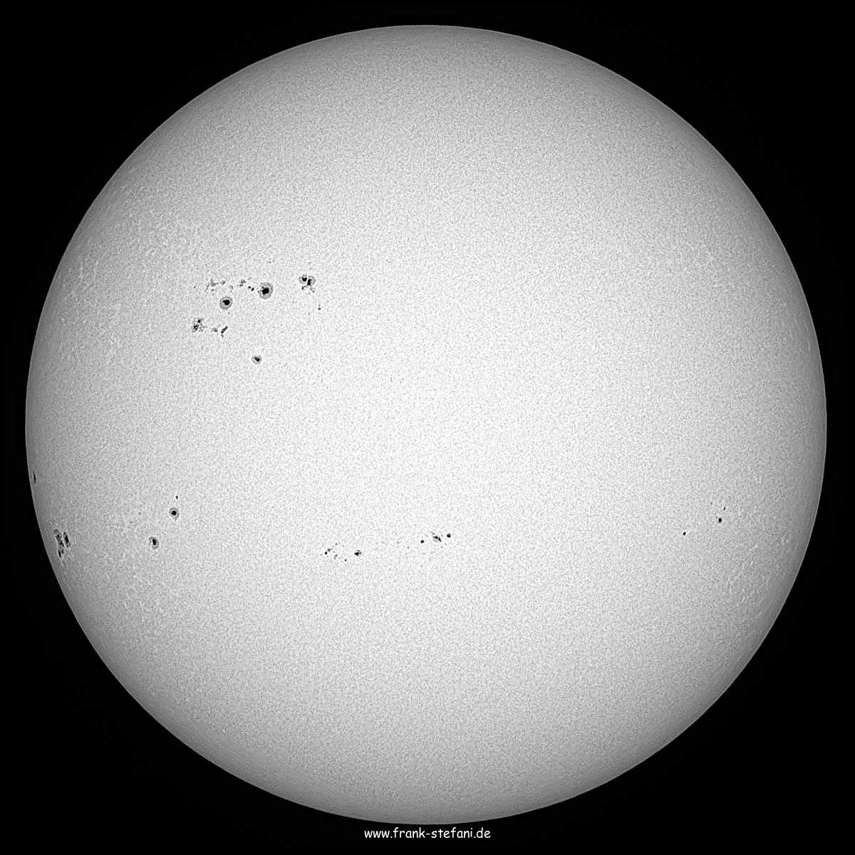 Heute ist das Seeing immer noch sehr störend, aber doch deutlich besser: Ich fotografiere 1300 Bilder mit je 0,032 Millisekunden Belichtungszeit, nachdem ich zuvor reichlich Zeit zum Fokussieren investiert habe: Die Pracht der zahlreichen größeren und vielen kleinen Sonnenflecken hat mich wieder einmal begeistert! Nur 100 Bilder werden zum Summenbild gestackt, danach folgt noch die übliche Ausarbeitung mit Schärfung und Anpassung der Tonwerte.