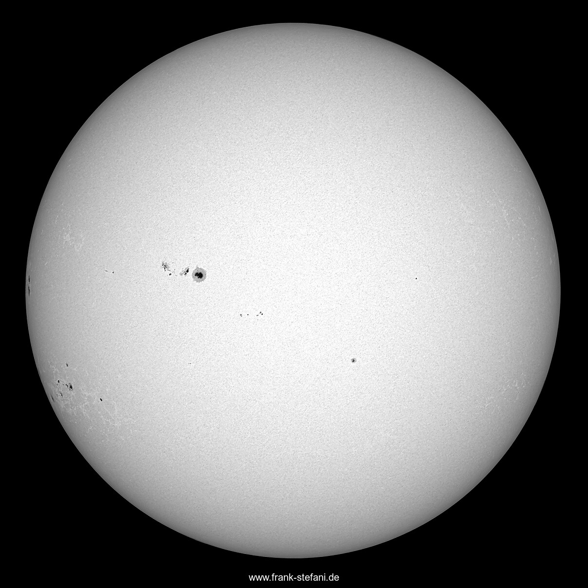 Der Schwerpunkt der im visuellen Spektrum des Lichts erkennbaren Aktivitäten auf der Sonnenoberfläche scheint sich wieder auf die südliche Hemisphäre zu legen. Knapp oberhalb des Äquators die Fleckengruppen der AR14191, von denen sich die westlichste am eindrucksvollsten zeigt: Eine relativ große, tiefschwarze Umbra, umgeben von einer schön gleichmäßig ausgeprägten Penumbra. Sowohl auf der Südseite (oben) als auch auf der Nordseite (oben) erkennt man mehrere in Entstehung befindliche Lichtbrücken, die sich aus der Penumbra in das umbrale Schwarz erstrecken. Gut möglich, dass sich dort in den nächsten Tagen einiges tun wird. Links davon weitere chaotisch angeordnete kleinere Flecke, sowie Penumbrae mit schon deutlicher und längere ausgeprägten Lichtbrücken. Deutlich südlich des Äquators entwickeln sich die aktiven Regionen 14195 bis 14197, wobei schon jetzt, dank der Randabdunkelung der Sonne weitflächige Fackelgebiete zeigen. Wenn das Wetter mitspielt, dürften sich auch die rein visuellen Beobachter wieder an viele schönen Details und Phänomenen erfreuen.