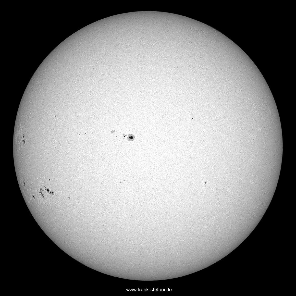 Wie es sich bereits gestern (25. August 2025) angekündigt hat ⇒ siehe https://www.spektrum.de/alias/wunder-des-weltalls/die-sonne-am-25-august-2025-es-wird-spannend/2284166 ⇐ sind nun tatsächlich zahlreiche Fleckengruppen am Westrand (links) der Sonne erschienen, die sich in den drei aktiven Regionen AR 14195 bis 14197 gebildet haben. Sie sind von wild mäandernden Fackelgebieten umgeben, die sich aufgrund der Randabdunkelung der Sonne sogar im Spektrum des sichtbaren Lichtes beobachten lassen. Das zugehörige Magnetogramm ⇒ https://solarmonitor.org/data/2025/08/26/pngs/shmi/shmi_maglc_fd_20250826_015843.png ⇐ bestätigt aufgrund seiner starken Ausprägung, diese Aktivitäten.