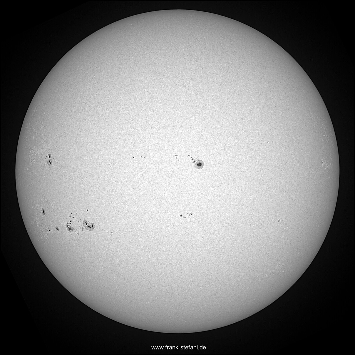 Die weiträumige Wetterlage war und ist ernüchternd, was den Zustand der Atmosphäre (Seeing) und insbesondere den der Troposphäre angeht, in der sich unser Wettergeschehen im wesentlichen abspielt. Schon am Vorabend zog es zu, nachts gab es keine Sterne und heute früh regnete es sogar aus der dichten, mittelhohen geschlossenen Wolkendecke. Einige hellblaue Lücken taten sich erst am späteren Vormittag auf - und nachdem ich gleich morgens auf ⇒ https://solarmonitor.org ⇐ erkundet hatte, wie sich die Fleckengruppen der aktiven Regionen AR 14195 bis AR 14197 inzwischen entwickelt haben, hoffte ich sehr, einige brauchbare Bilder machen zu können. Der Himmel wurde nicht klar, aber der hohe milchige Schleier der Zirruswolken war in der Umgebung der Sonne immerhin einigermaßen gleichförmig grau. Die Sonne war also gar nicht mal so übel auf dem Sensor zu sehen, allerdings deutlich abgedunkelt. Die genannten Fleckengruppen haben über Nacht noch »Nachwuchs« erhalten - zwei neue aktive Regionen sind in direkter Umgebung ausgewiesen worden: AR 14201 und AR 14202. Diese haben ebenfalls Sonnenflecke ausgebildet. Aufgrund der ziemlich chaotischen Entwicklung der Flecke auf diesem Teil der Sonne, darf man gespannt sein, wie es in den nächsten Tagen weitergehen wird.