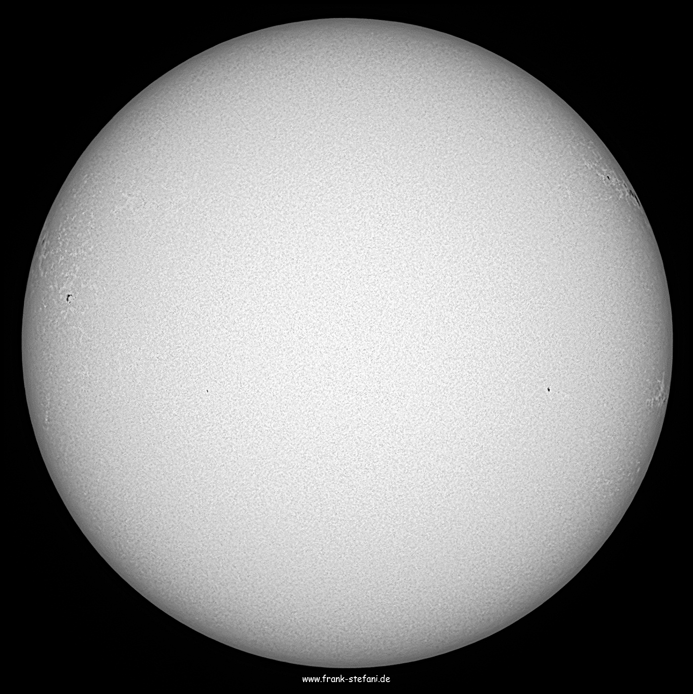 Naja ... eigentlich gibt es nicht viel zu sehen. Ich war neugierig, was man mit dem »Antlia Triband RGB Ultra«-Filter hinter dem »Baader AstroSolar-Folienfilter« sehen kann, den ich normalerweise zusammen mit einem UV/IR-cut-Filter verwende, um die gesamte Sonnenscheibe aufzunehmen. Ich dachte, ich könne mit diesem Filter etwas mehr H-Alpha heraus arbeiten als mit dem UV/IR-Sperrfilter. Dies scheint nicht der Fall zu sein – ich weiß nicht, warum. Ich werde es noch einmal versuchen, wenn die Sonne wieder aktiver wird und größere Sonnenflecke, Lichtbrücken und Fackelgebiete entstehen, die bereits im visuellen Lichtspektrum zu sehen sind.