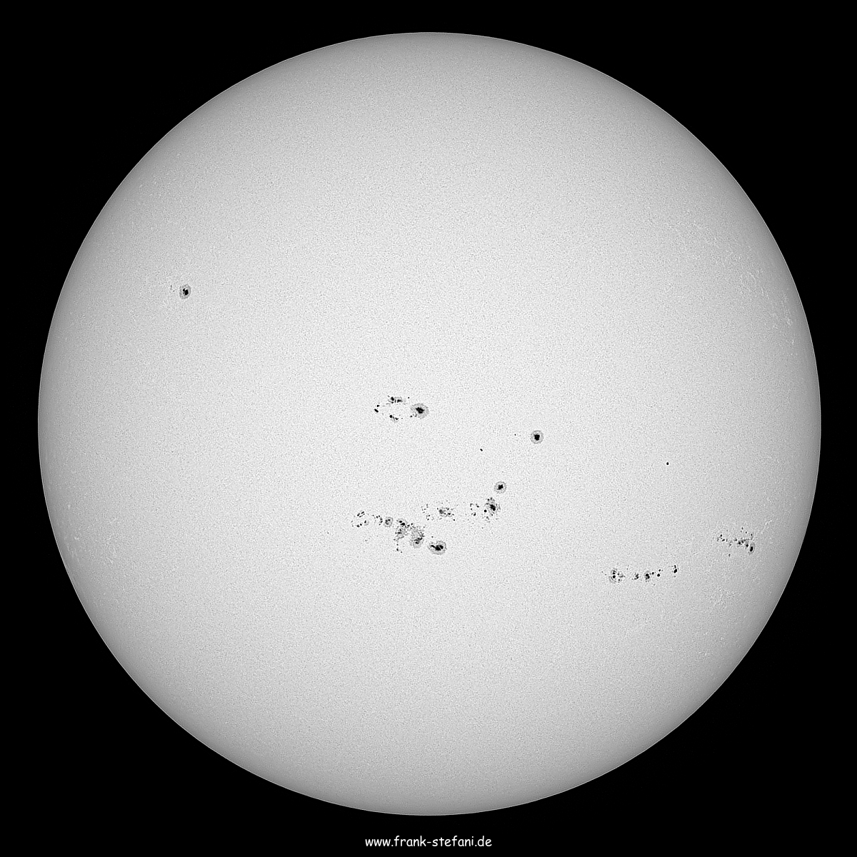 Die aktiven Regionen AR 13756 bis AR 13770 zeigen ihre lebhaften, im visuellen Spektrum sichtbaren, Auswirkungen um das Zentrum der Sonnenscheibe herum. Erst am Nachmittag konnte ich zwischen den sich auflösenden Hochnebel artigen Wolken fotografieren. Das Seeing war und ist wirklich übel, hier in den Alpen, sodass ich nur mit einer geringen Anzahl von 50 aus 1000 Bildern ein brauchbares Ergebnis erzielen konnte. Nur aufgrund der sehr kurzen Belichtungszeit der Einzelbilder mit nur 1/31250s je Bild (0,032ms oder 0,32µs) wurde das Blubbern der Atmosphäre eingefroren ... bei einer bodennahen Temperatur von 30°C. Es sind wieder unzählige Sonnenflecke, Umbren und Penumbren in völlig verschiedener Ausprägung, Größe und Verteilung zu sehen, ebenso mehrere umbrale Lichtbrücken und einige Fackelgebiete, die hier etwas heller als ihre Umgebung sichtbar werden und mich an mäandernde Wasseradern erinnern.