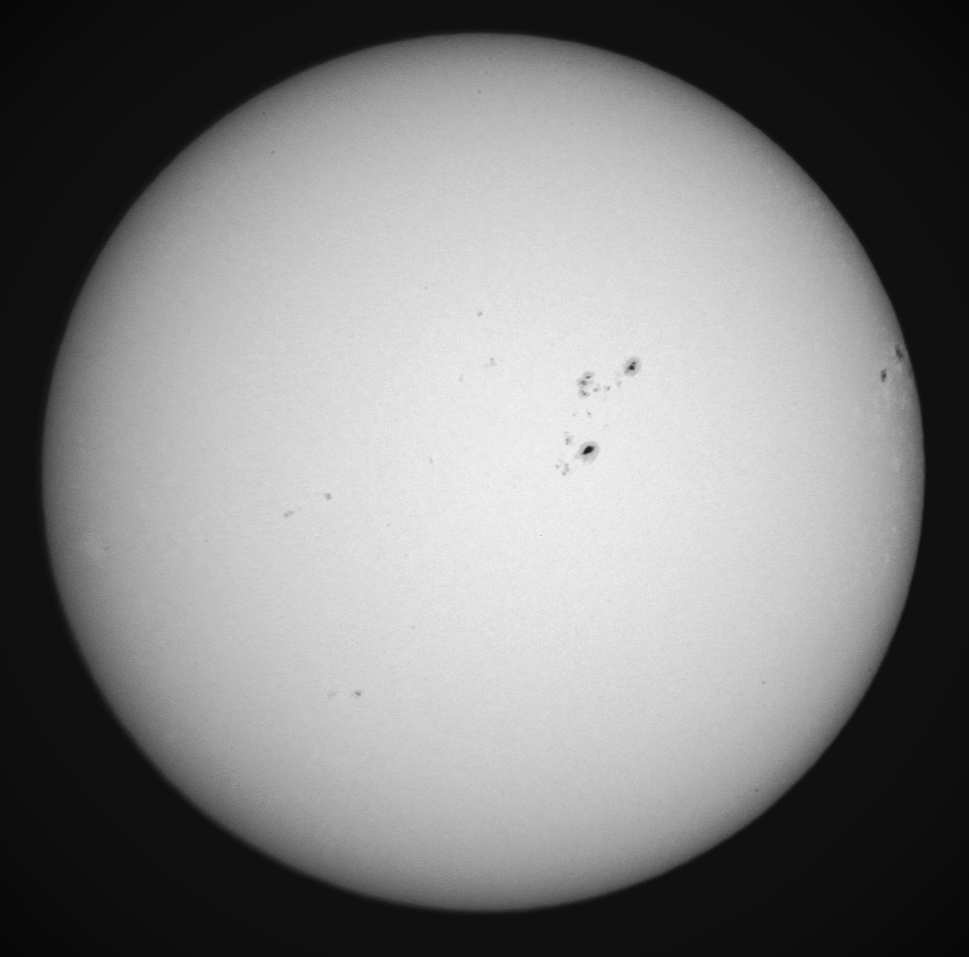 Nach einigen Tagen intensivem Tiefdruckwetter ist der Himmel heute endlich wieder von Wolken freigeräumt. Damit ist der Blick auf die Sonne, auf der sich neben einigen kleineren Flecken nur zwei größere Fleckengruppen zeigen, frei.