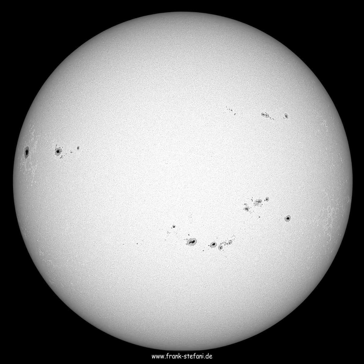 Wie es sich gestern (29. Oktober 2024) ankündigte und anhand des Magnetogramms zweifelsfrei zu erkennen war, gehört die nun prominent am westlichen (linken) Sonnenrand oberhalb des Äquators erschienene Fleckengruppe nicht zu der gleich rechts neben ihr liegenden aktiven Region. Es handelt sich um eine neue, eigenständige Region - deshalb erhielt sie auch eine neue Bezeichnung: AR 13879. Das heutige Magnetogramm belegt die deutliche Trennung beider aktiven Regionen: https://solarmonitor.org/full_disk.php?date=20241030&type=shmi_maglc&indexnum=1 - ein Vergleich mit meinem Bild und dem Magnetogramm von gestern veranschaulicht die Entwicklung: https://www.spektrum.de/alias/wunder-des-weltalls/die-sonne-am-29-oktober-2024/2240350