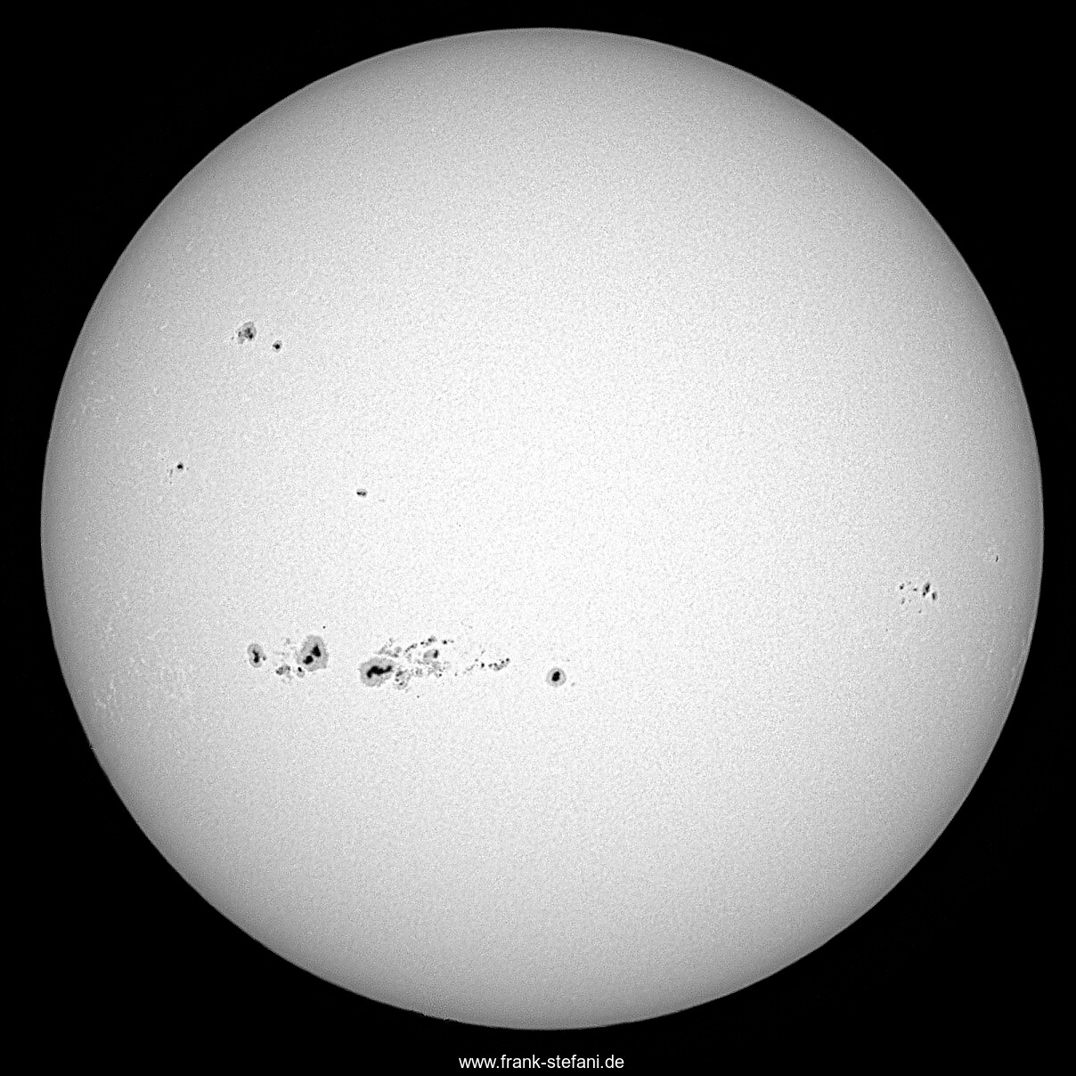 Die Sonne rotiert! So wie sich die Erde um ihre eigene Achse von West nach Ost dreht - und damit dem von der Erde aus wahrgenommenen Sonnenaufgang entgegen, dreht sich auch die Sonne in der gleichen Weise von West nach Ost. Dadurch erscheinen neue Flecke und Fleckengruppen zuerst an ihrem linken (westlichen) Rand, bevor sie allmählich ins Zentrum der Sonnenscheibe wandern, um später am rechten (östlichen) Rand zu verschwinden. Die drei markanten äquatornahen aktiven Regionen AR 14298, AR 14294 und AR 14296 erschienen nach und nach in der genannten Reihenfolge am linken (westlichen) Sonnenrand. Als der vergleichsweise kleine Fleck der AR 14298 erschien - mit fast rundlicher Umbra und gleichmäßiger Penumbra - konnte noch niemand ahnen, dass kurz darauf die beiden viel ausgeprägteren, teils chaotischen Fleckengruppen der beiden anderen genannten aktiven Regionen erscheinen würden. Bei stark fallendem Luftdruck, hoher Luftfeuchtigkeit, stehen bleibenden Kondensstreifen und ausgehnten Zirren in der Höhe, sowie sich rasch bildenden Kumuluswolken über den Bergen, sowie den vom flachen Alpenvorland in unser Alpental herein ziehenden Hochnebelfeldern, hatte ich das große Glück, die um diese Zeit nur 15 Grad über dem Horizont stehende Sonne dennoch einigermaßen klar und scharf fotografieren zu können: Zwei hochfrequente Bildserien (40 fps) konnte ich aufnehmen und zum Ende der zweiten Bildserie verschwanden die letzten Bilder bereits hinter den nun eintreffenden Hochnebelfeldern. Weil es das erste Mal seit über zwei Monaten war, das ich heute fotografieren konnte, freut es mich besonders, dass ich diesen kurzen Zeitraum für dieses Foto nutzen konnte.