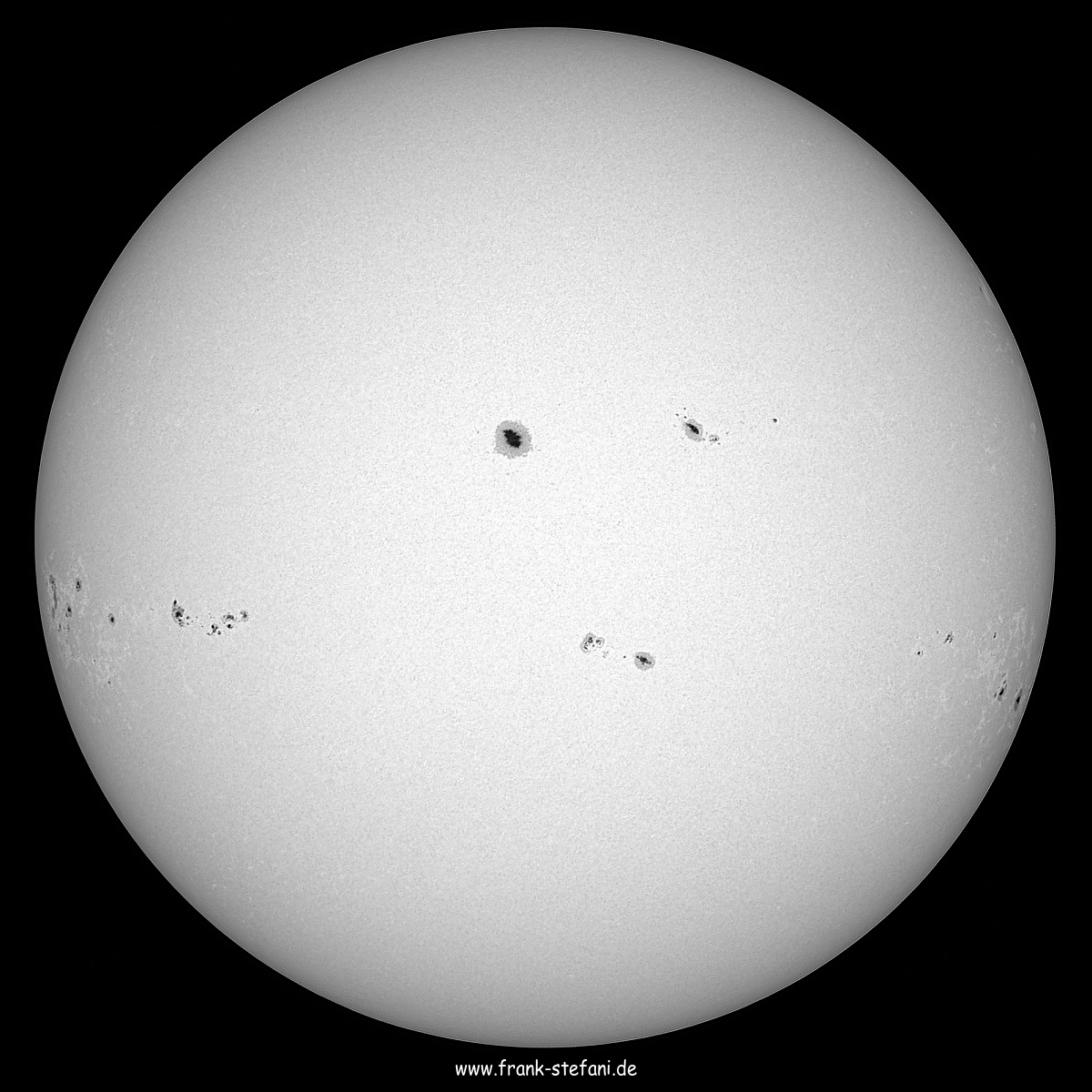 Selbst im visuell sichtbaren Spektrum ist die Sonne nach wie vor sehr aktiv. Unvorhersehbar sind die Anzahl, die Größe und die Positionen der zu erwartenden Sonnenflecke - falls sich überhaupt welche entwickeln. Heute sind wieder eine Vielzahl interessanter Erscheinungen zu beobachten: Innerhalb einer Woche sind die aktiven Regionen AR 13878 und AR 13879 vom westlichen (linken) Sonnenrand zum Zentrum der Sonnenscheibe gewandert, dabei AR 13879 prominent oberhalb des Sonnenäquators mit der gegenwärtig größten Umbra, die von einer ebenfalls prächtig ausgeprägten Penumbra umgeben ist. Zudem scheint deren Umgebung ziemlich ruhig zu sein. Ihr großer Fleck liegt da wie eine Insel mit Atoll im Pazifischen Ozean. Knapp südlich des Äquators geht es lebhaft zu: Dort scheint eine regelrechte "Fleckenparade" herein zu wandern. Deutlich erkennt man die Fackelgebiete in der Randabdunkelung der Sonne, sowie überwiegend kleine und chaotisch aussehende Flecke, die aber insgesamt als lange Reihung erscheinen, vielleicht sogar als Fortsetzung der etwa auf gleicher breite liegenden Fleckengruppen in der Mitte und am östlichen (rechten) Rand der Sonne.