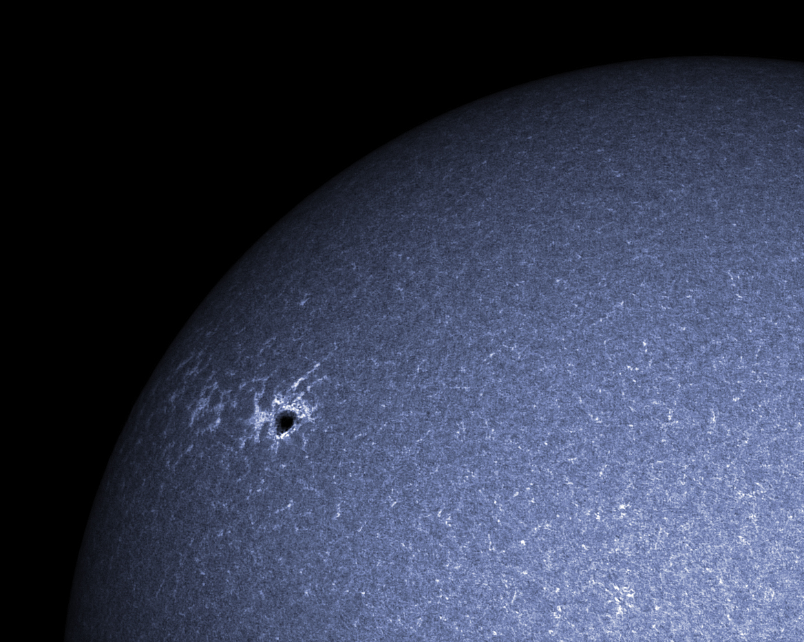 Die Sonne im Licht der K-Linie des Kalziums. Für diese Aufnahme wurde der H-Alpha-Ansatz des Lunt 152 durch den Ca-K-Ansatz ersetzt.