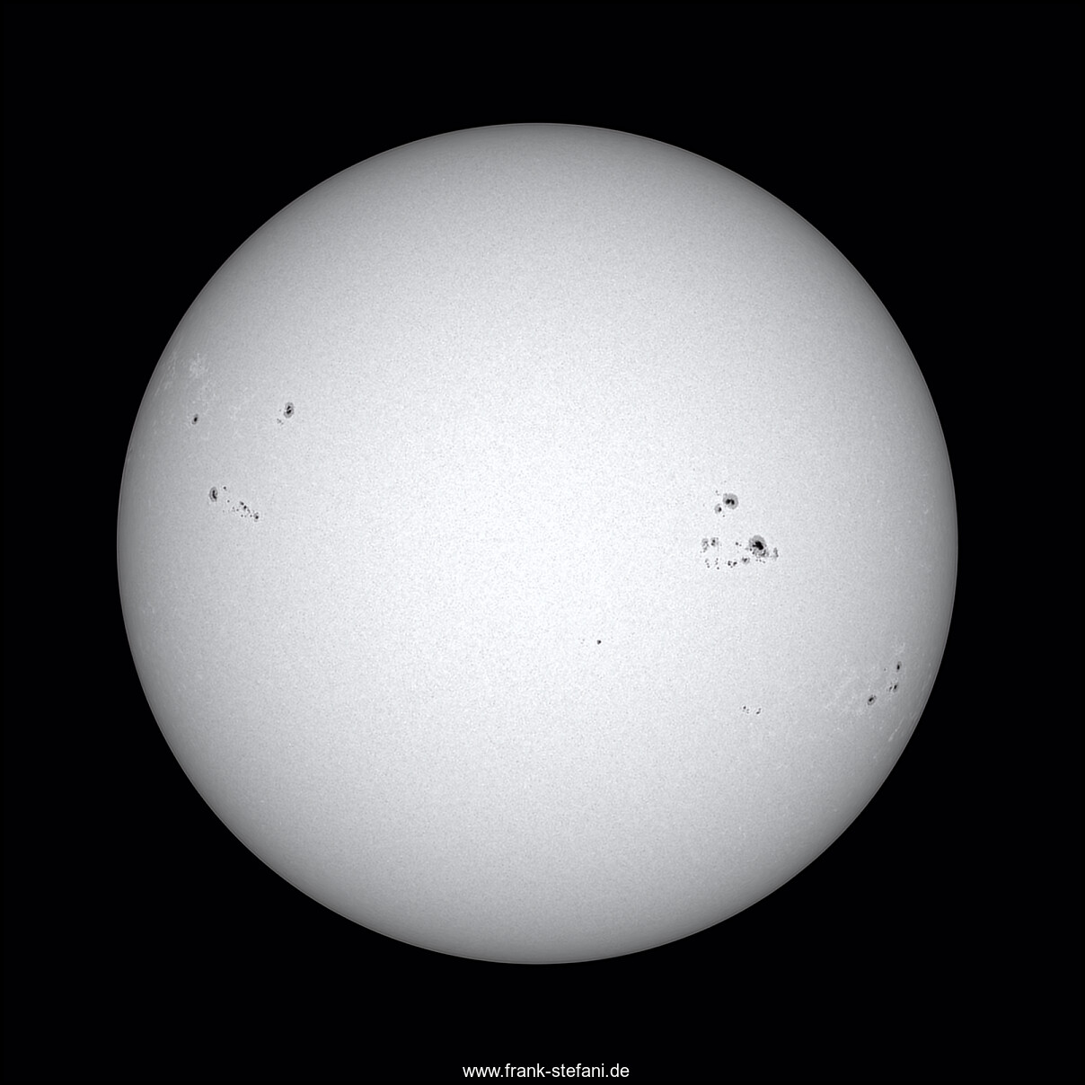 Die Sonne zeigt sich auch im Spektrum des sichtbaren Lichts immer wieder aktiv. So gibt es gerade zehn aktive Regionen und diese bringen auch Sonnenflecke hervor. Es fällt auf, dass vor allem die nördliche Hemisphäre der Sonne aktiv ist, während im Süden nur wenig aufregendes tut. Das Magnetogramm belegt diese Aktivitätsverteilung seht deutlich: https://solarmonitor.org/full_disk.php?date=20250807&type=shmi_maglc&indexnum=1 In der Randabdunkelung der Sonne erkennt man zudem mäandernde Fackelgebiete, ebefalls in der Nähe der visuell sichtbaren Flecken.