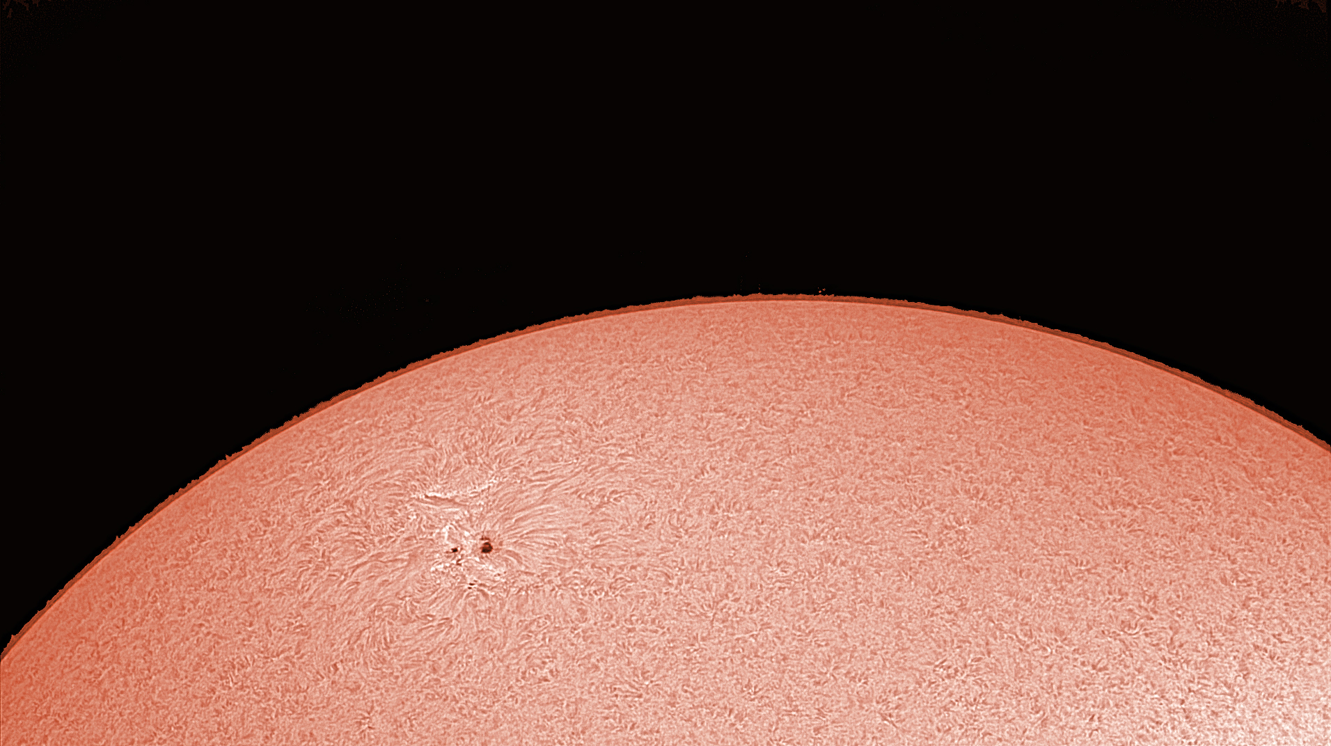 Die H-Alpha-Aufnahme der Sonne zeigt eine neue Fleckengruppe. Westen ist auf dem Bild oben.