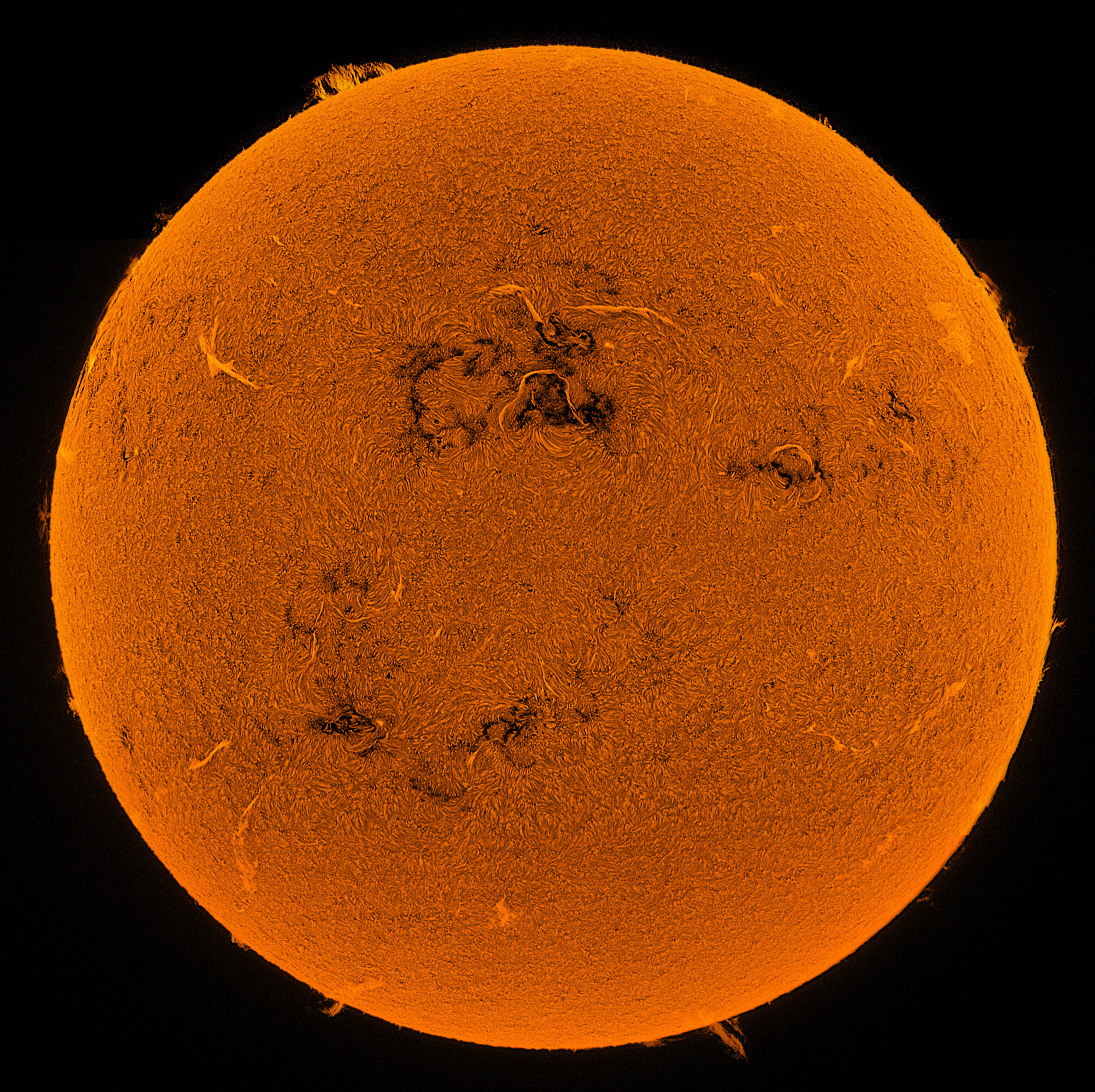 Beste Verhältnisse lockten zur Sonnenfotografie. Die Sonnenaktivität auf dem Bild ist dem 11- jährigen Zyklus entsprechend eher gering bis mittelmässig. Verwendet wurde der 60 mm Double Stack Aufsatz auf dem 60 x 500 mm Lunt. Es wurden 2 AVI's aufgenommen (jeweils für eine Sonnenhälfte). Die Sonnenscheib ist invertiert bearbeitet.