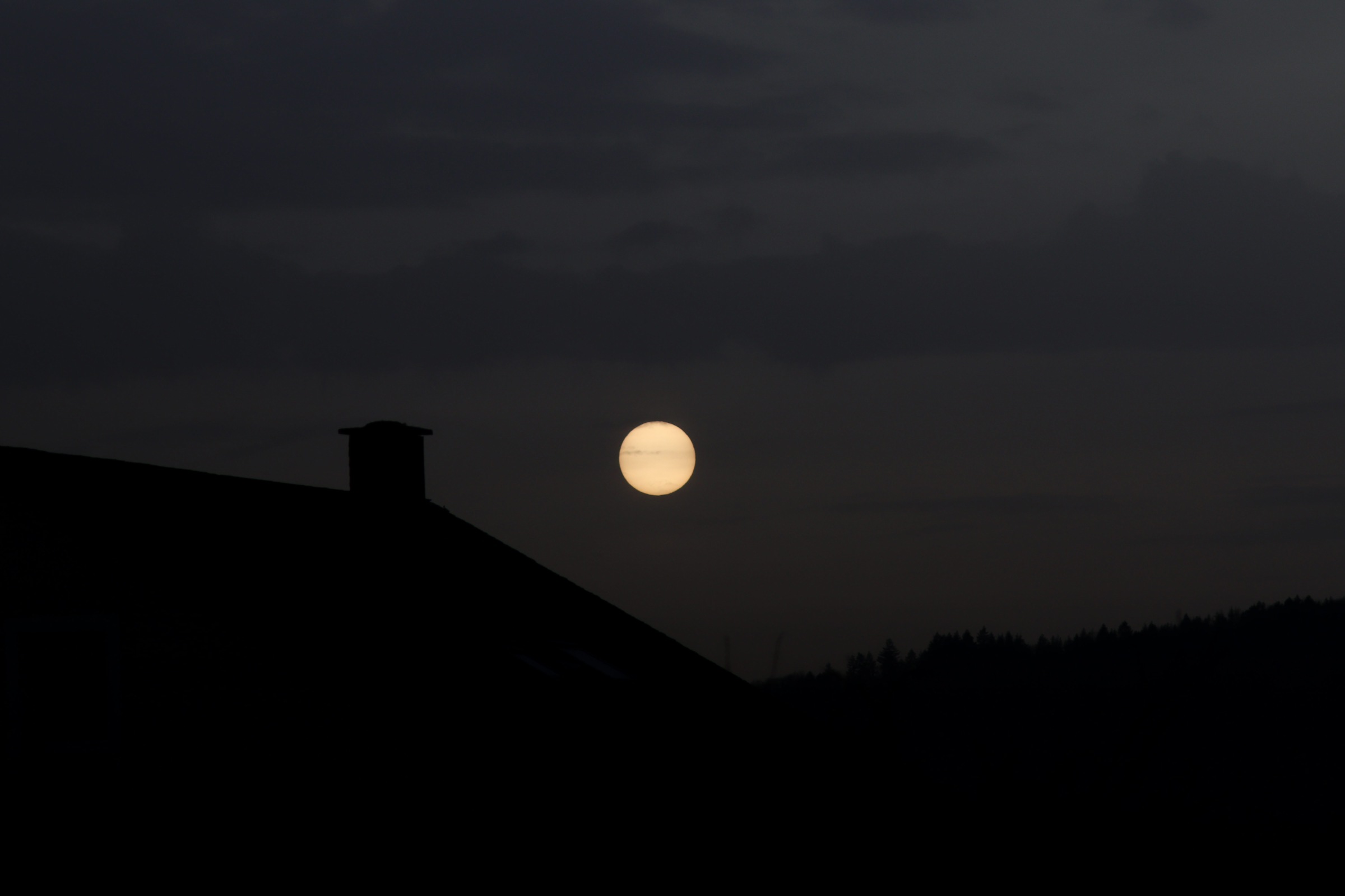 Saharastaub sorgte am 22. Februar 2021 über Rheinland-Pfalz und dem Saarland für trübes Wetter und Wolkenbildung. Wie durch einen Nebelschleier zeigte sich die Sonne vor Sonnenuntergang am westlichen Horizont. Die hier gezeigte Aufnahme entstand um 17:30 Uhr ohne jegliche Filter. Der Weißabgleich der Kamera wurde auf natürliches Tageslicht eingestellt. Eine solch abgefilterte Sonne, hervorgerufen von Saharastaub, habe ich selten erlebt.