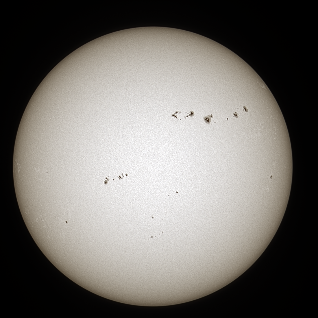 Bei den Bedingungen ging nur etwas mit einer kleinen Öffnung, die nicht so anfällig bezüglich des sogenannten Seeings bei Turbulenzen und Wolken ist. So habe ich mit 60 mm Öffnung die Sonne in einer Gesamtansicht aufgenommen. Von Sonnenfleck AR14135 bis AR 14147 ist alles dabei. Und in AR 14136 ist eine deutliche Lichtbrücke zu sehen. Einige Fackelgebiete sind auch auszumachen. Selbst mit "nur" 60mm Öffnung zeigen sich schöne Details.