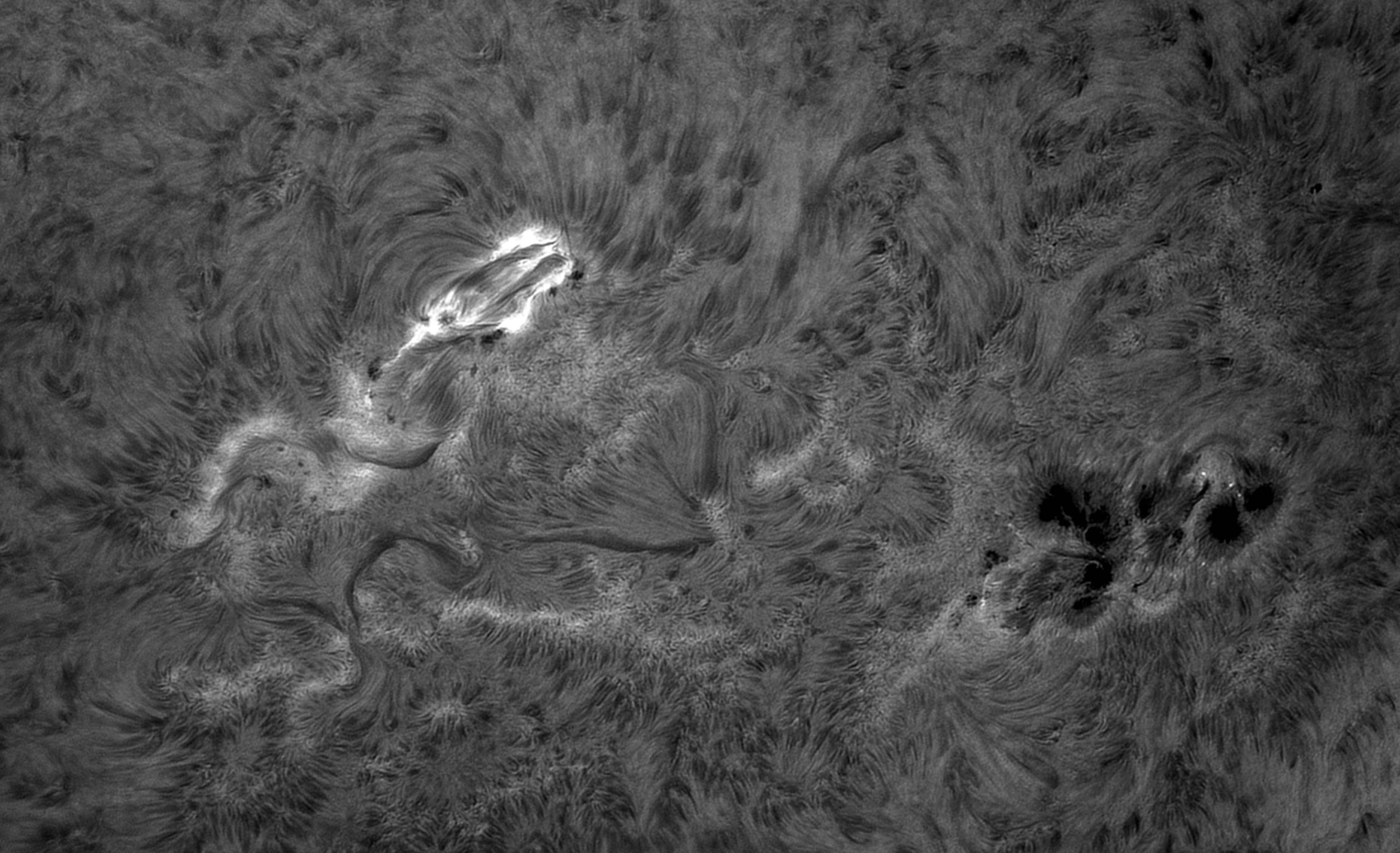 AR13014 ist eine riesige und äußerst aktive Region. Eine komplexe Fleckengruppe nähert sich dem Ende ihres Lebenszyklus. Um diese einige Ellermann-Bomben (Mikroflares), die in dem hier verwendeten blauen Flügel der H-Alpha-Linie bestens zu erkennen sind. Auf dem Bild links ein äußerst aktiver Teil der aktiven Region mit außerst komplexen Magnetfeldern.