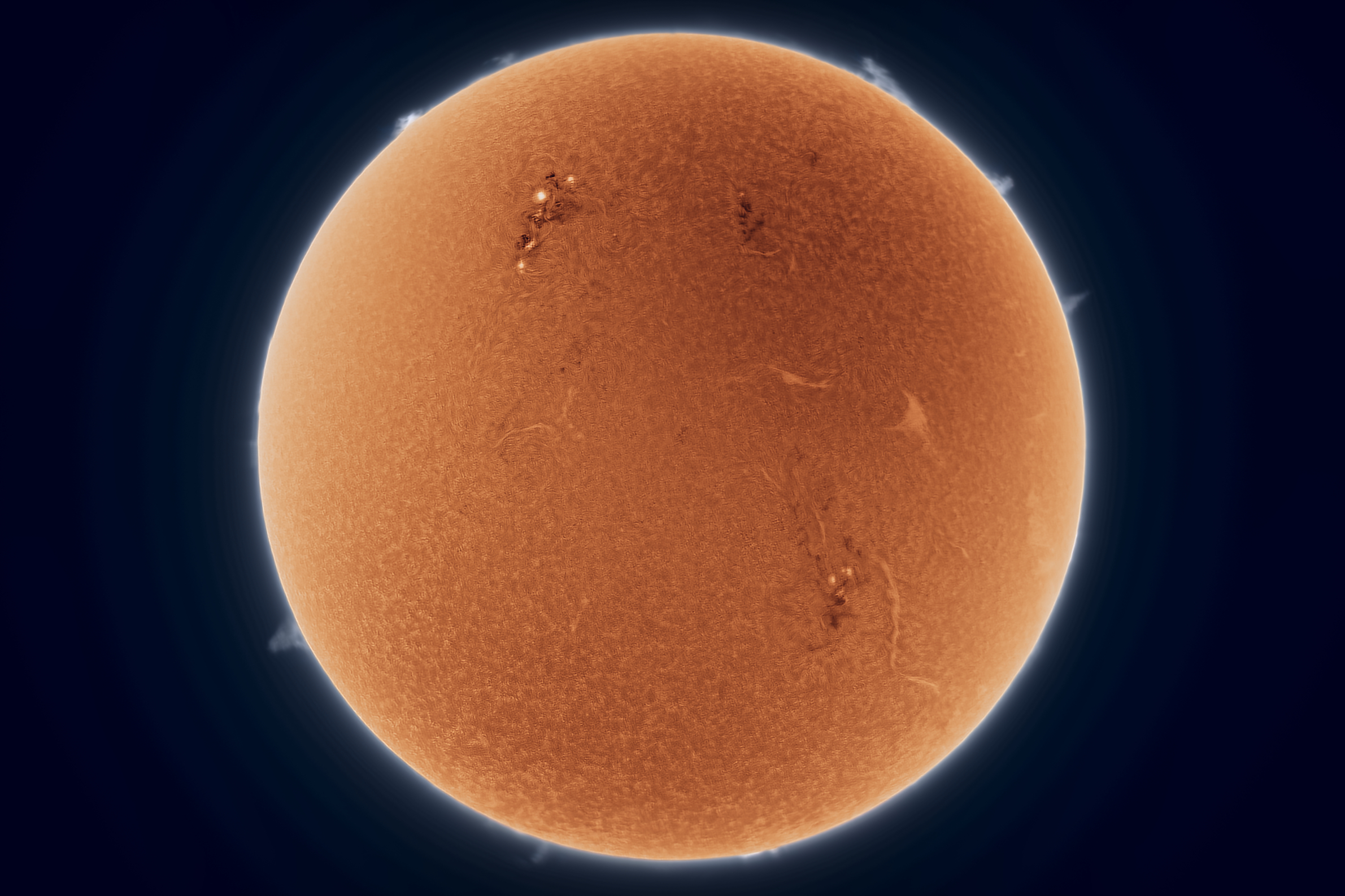 Die Aktivität der Sonne ändert sich ständig. Im Bereich des ionisierten Wasserstoffs (in der H-Alpha-Spektrallinie) zeigt sie eine aktive Oberfläche und Protuberanzen.
