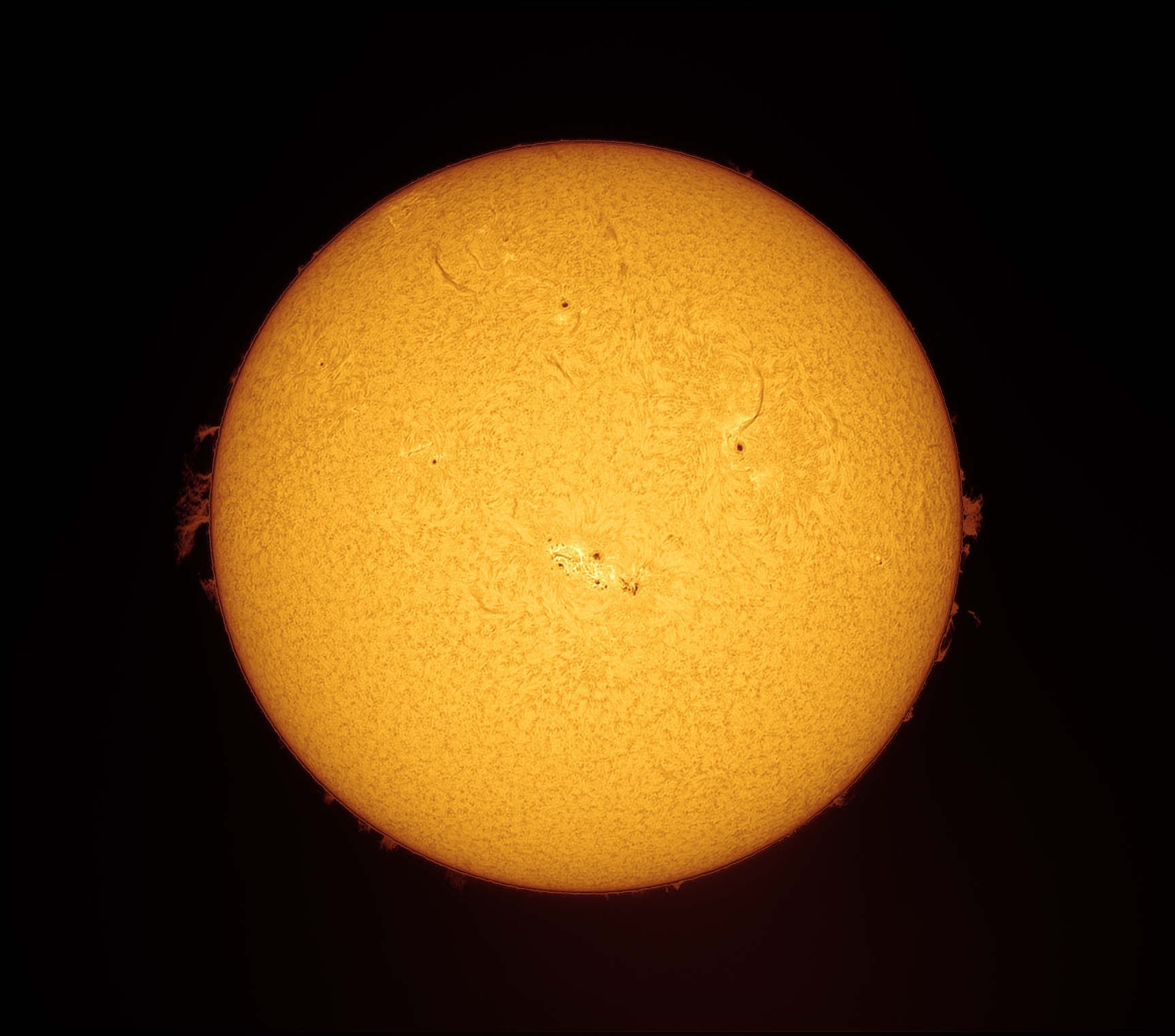 Der Aktivitätszyklus der Sonne nähert sich dem Maximum und als sich in der zweiten Märzhälfte endlich eine sehr vielversprechende Region der Erde zuwandte, spielte das Wetter natürlich nicht mit. Am Sonntag, den 24. März 2024, war es sehr windig und die Wolken zogen in großen Fetzen über den Himmel. Durch eine Wolkenlücke gegen Mittag gelang mir diese eindrucksvolle Aufnahme. Schön zu sehen ist die riesige Aktivitätsregion AR3615 in der Nähe der Mitte der Sonnenscheibe. Die eindrucksvollen Randprotuberanzen und Filamente runden den geglückten Schnappschuss ab. Ein Versuch war es allemal wert!