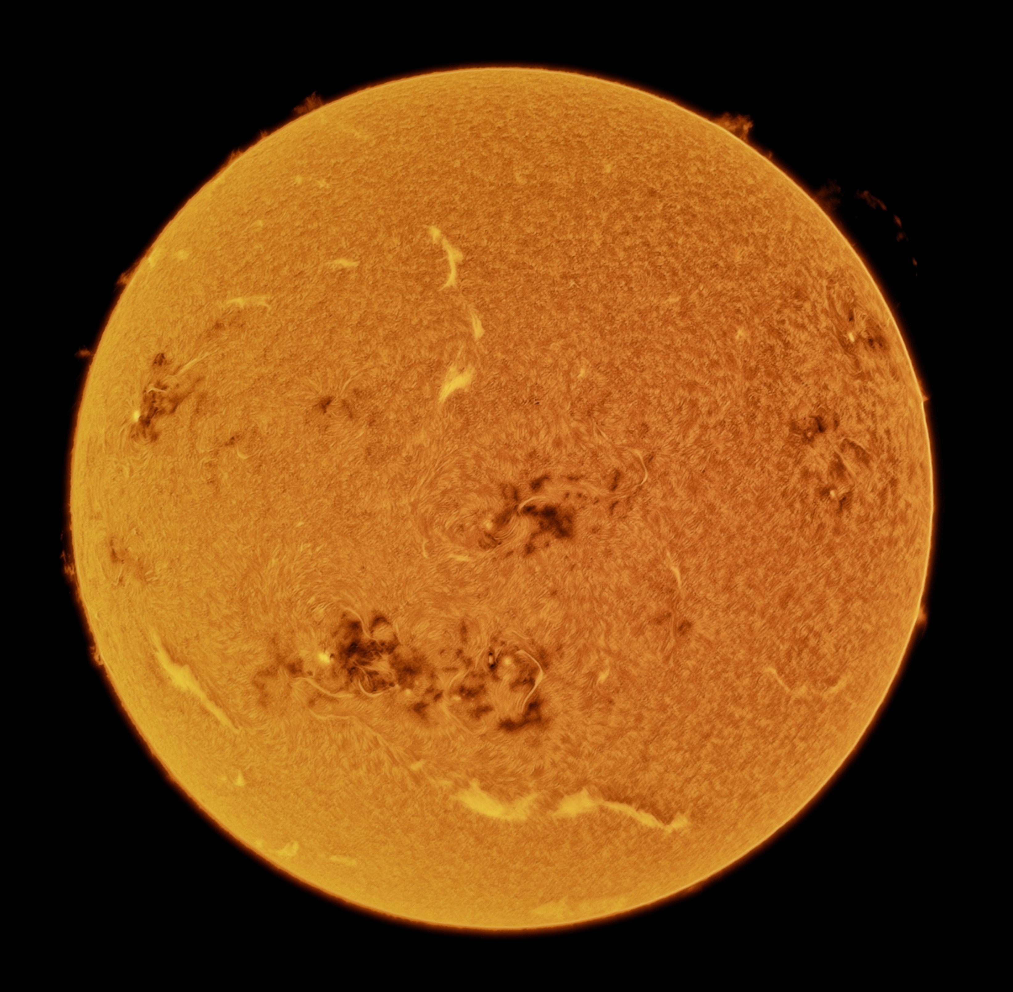 Protuberanzen am Rand – Besonders gut sichtbar sind mehrere Ausbrüche am oberen und rechten und linken Rand, die sich als kleine, helle Bögen vom Sonnenrand abheben. Filamente auf der Scheibe – Dunkle, längliche Strukturen innerhalb der Sonnenscheibe, die wie Fäden aussehen. Aktive Regionen & Sonnenflecken – In der unteren Hälfte gibt es deutlich dunklere, unruhige Zonen – hier befinden sich große Sonnenfleckengruppen. Granulation und feine Strukturen – Die gesamte Oberfläche zeigt die typische H-alpha-Struktur der Chromosphäre.