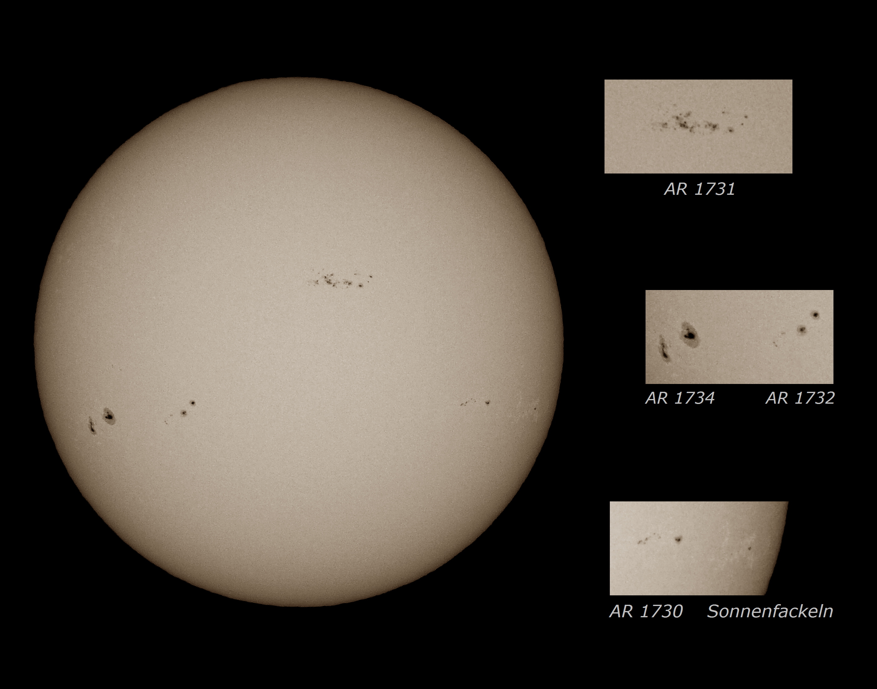 Der Monat Mai fing astronomisch gut an, einige schöne Fleckengebiete zeigten sich auf der Sonne. Für diese Sonnenübersicht verwendete ich nur ein Fotostativ, ein sehr einfaches Teleobjektiv (Vierlinser/Achromat) mit Telekonverter, ein neu gekauftes Grünfilter für das Objektiv (vorher verwendete ich Okulargrünfilter, diese ließen sich aber immer schwer einbauen) sowie die 3,8 Sonnenfolie. Das Grünfilter dient zum unterdrücken des blauen und vor allem auch sehr störenden roten Farbfehlers des Teleobjektivs.
