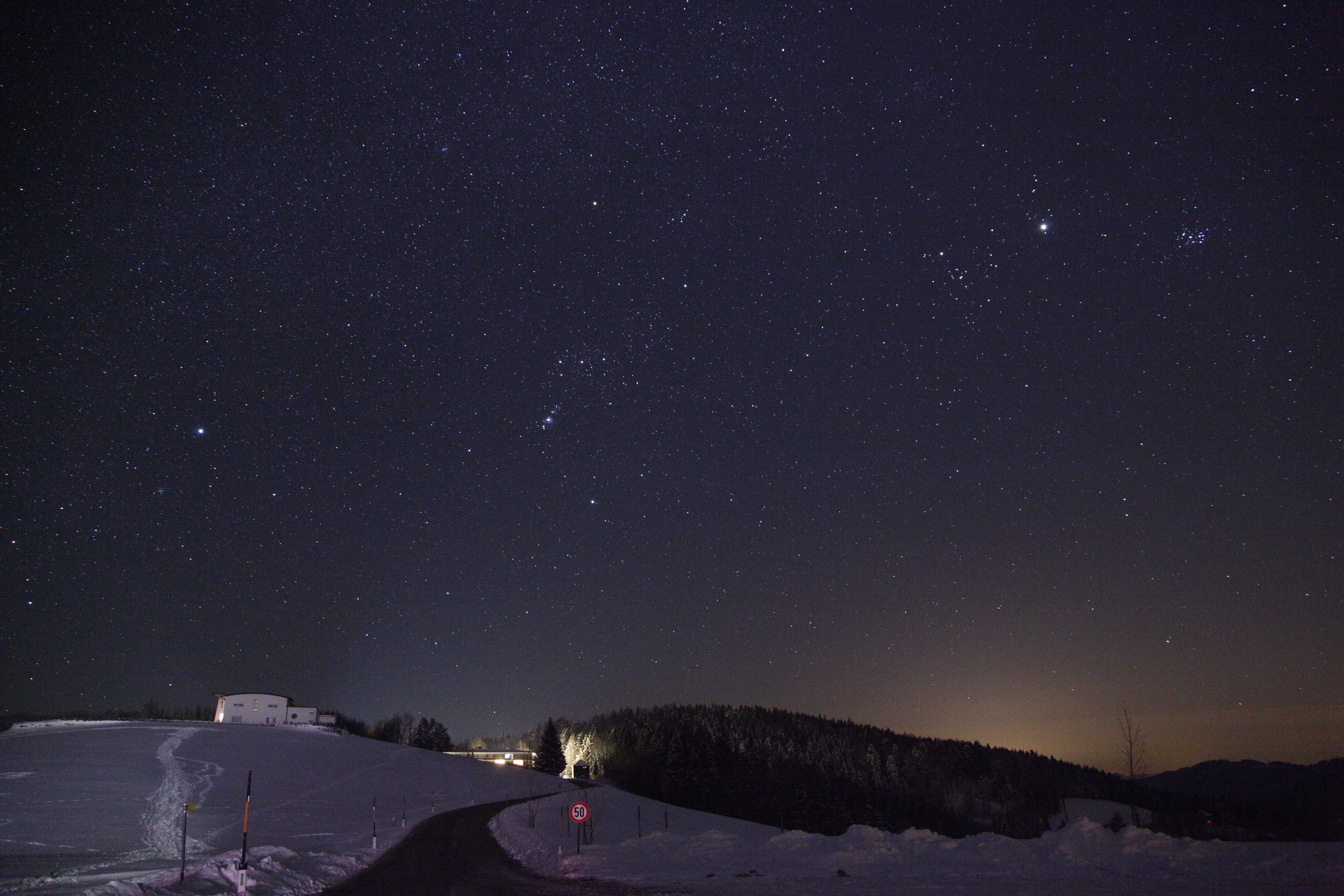 Bei bitterer, windiger Kälte um -10° war der Blick vom Gmundener Berg phänomenal. Mehr als 200 Meter über dem Dunst am Traunsee konnte auch die kleine Lichtglocke des fast 60 km entfernten Salzburg den Blick auf die hellen Sterne des Winterhimmels - mit Jupiter in ihrer Mitte - nicht trüben. Für das bloße Auge war der Himmel pechschwarz und übersät mit unzähligen und vor allem hellen Sternen.