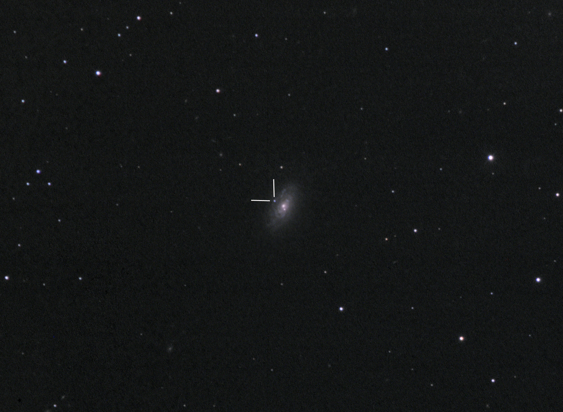 Nachdem ich die Supernova 2013df in der Nacht zum 12.6. schon visuell beobachten konnte, gelang mir auch eine Fotografie der Sternexplosion. Mit 14,4 mag liegt sie gut in der Reichweite mittlerer Teleskope. Leider kamen mir die Wolken sehr rasch dazwischen, was die Belichtungszeit all zu sehr verkürzte.