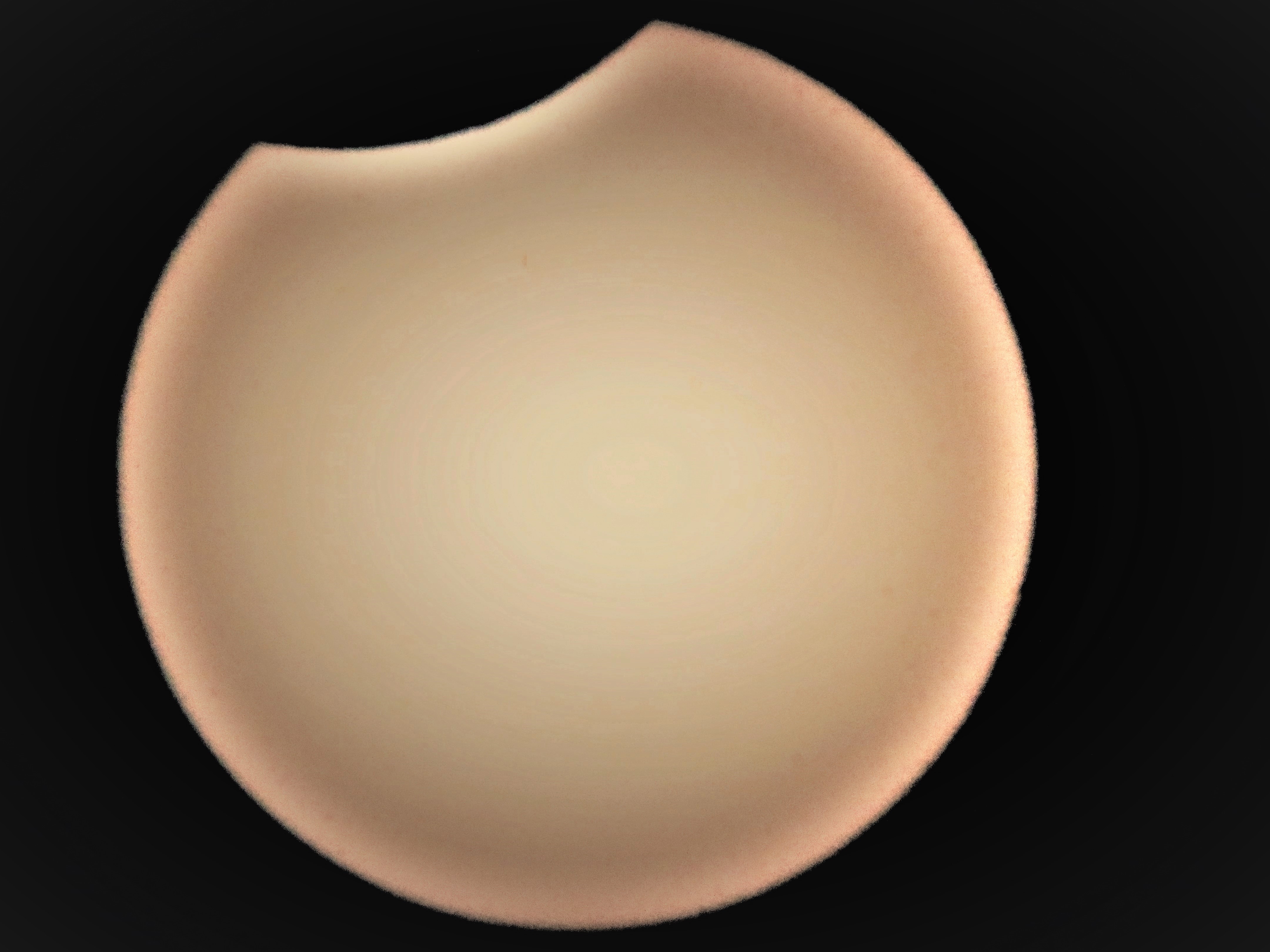 Ich habe mich am 10. Juni 2021 mittags auf die Lauer gelegt, um mit meinem Teleskop die am blauen Wiener Himmel sichtbare partielle Sonnenfinsternis einzufangen. Dabei ist mir dieses schöne Bild der fleckenlosen, aber durch den Mond angeknabberten Sonnenscheibe ins Netz gegangen.
