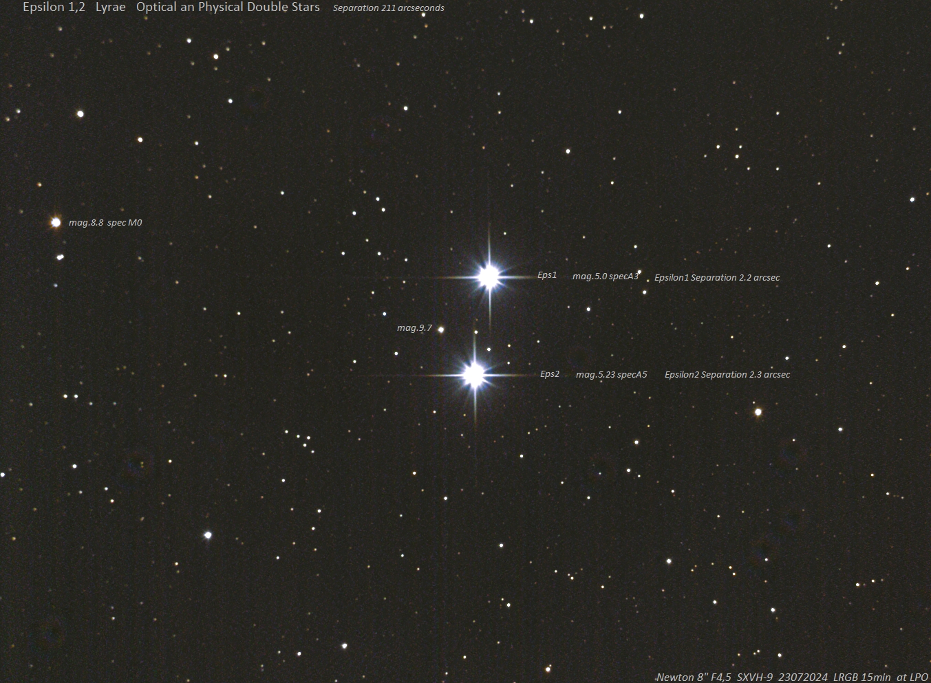 Er ist einer der interessantesten Doppelsterne am Himmel und ein Lieblingsobjekt für visuelle Beobachter. Sein Spitzname ist »Doppel-Doppel« und er ist 162 Lichtjahre von der Erde entfernt. Bekannt als Prüfstern (optischer Doppelstern) für scharfe Augen (scheinbarer Abstand 211 Bogenminuten), besteht er aus zwei physischen Doppelsternen, die einander umkreisen, allerdings benötigen sie für einen Umlauf einige hunderttausend Jahre! Die Umlaufzeit der nördlichen Komponenten (Eps1) beträgt ca. 1800 Jahre, die der südlichen (Eps2) hingegen nur 724 Jahre. 1985 entdeckte man noch einen fünften Stern um Eps2 mittels Speckle-Interferometrie im Abstand von 0,1 Bogensekunden!