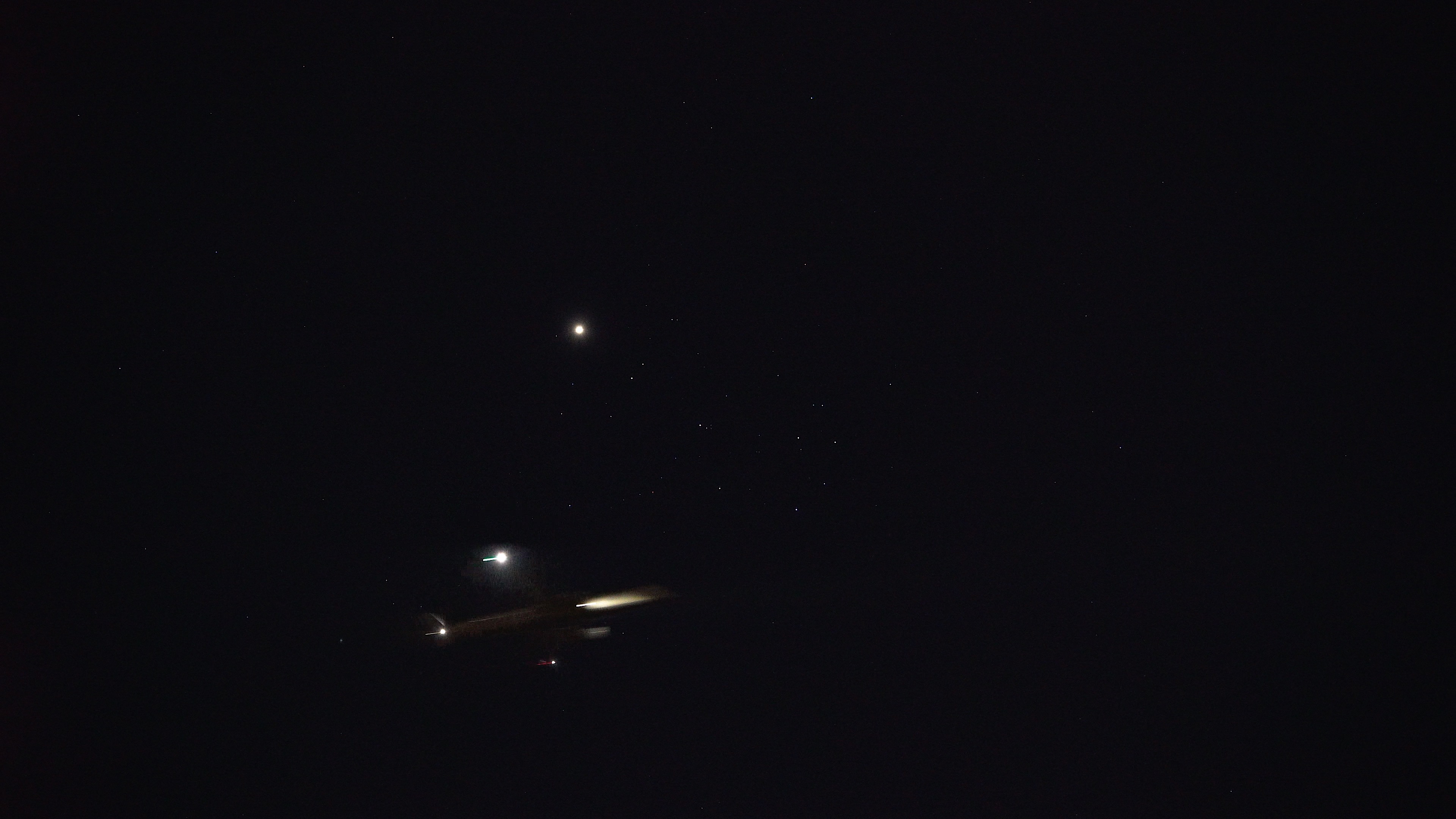 So gut wie kein Flugzeug am Himmel und dann doch "mittendurch". Bild ist aus einem 4K-Video. Die Positionsleuchte sieht aus wie die doppelte Venus.