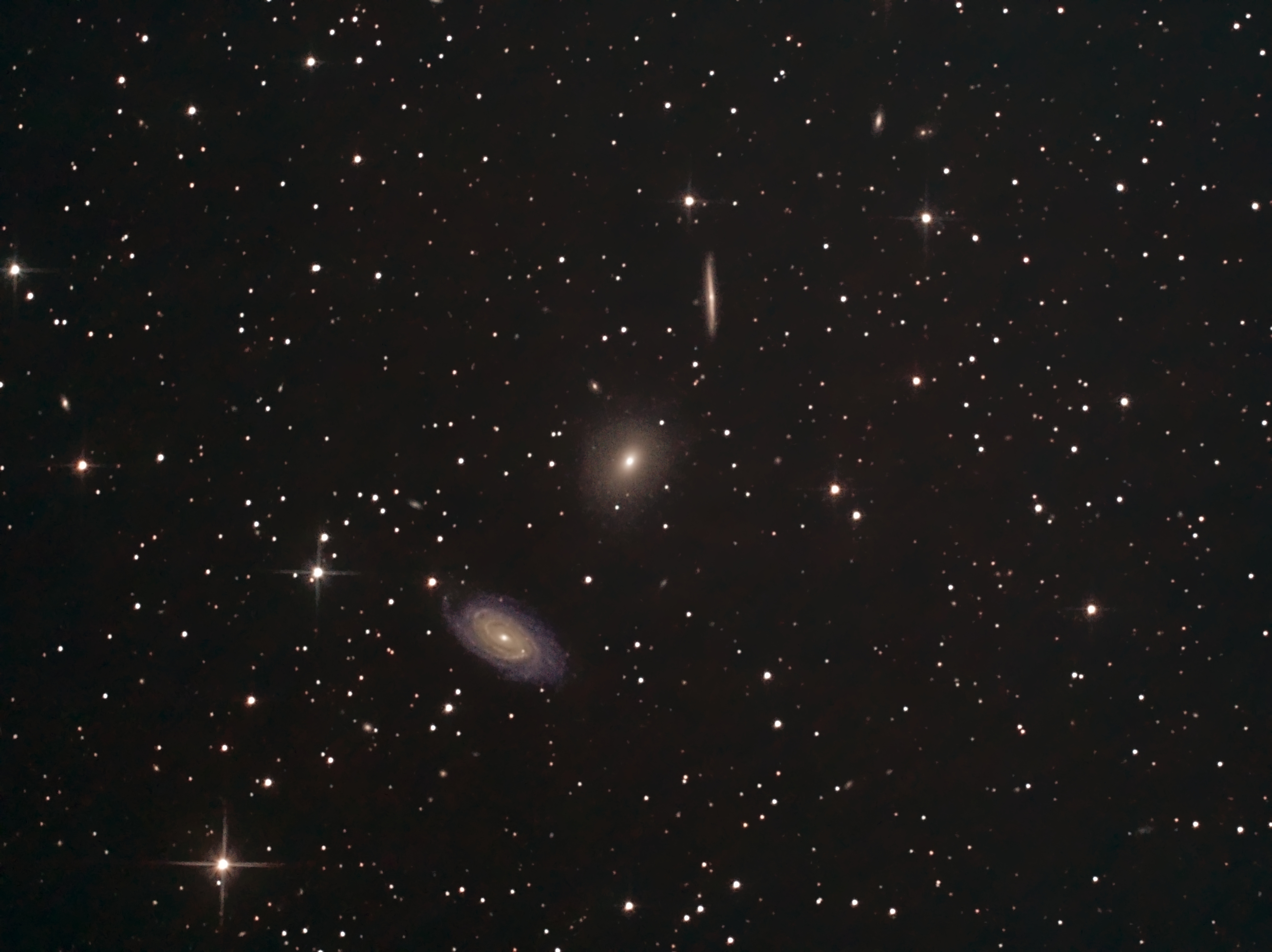 Unlängst hatte ich meine schon etwas ältere Aufnahme des bekannten Draco-Tripletts neu bearbeitet und dabei zur Generierung einer etwas optimaleren Auflösung das Drizzle-Verfahren mittels Deep Sky Stacker Version 4.1.1 (dreifach) angewendet. Ich bin jedes Mal wieder erstaunt, welch überraschender Effekt einer besseren Detailsichtbarkeit damit verbunden ist. Das Draco-Triplett besteht aus drei markant unterschiedlich aussehenden Welteninseln, der schönen Spiralgalaxie NGC 5985 (unten links), der elliptischen NGC 5982 (mitte) und der markanten Edge on-Galalaxie NGC 5981. Leider ist das bei der zuletzt genannten Galaxie vorhandene Staubband in der Äquatorregion nicht genügend herausgekommen, was aber für eine handelsübliche DSLR mit Bayermatrix kaum verwundern kann … Das Draco-Triplett gehört ob seines interessanten Erscheinungsbilds am Himmel zu den attraktivsten Zielen für Astrofotografen am nördlichen Sternhimmel, was jeder leicht nachvollziehen kann …