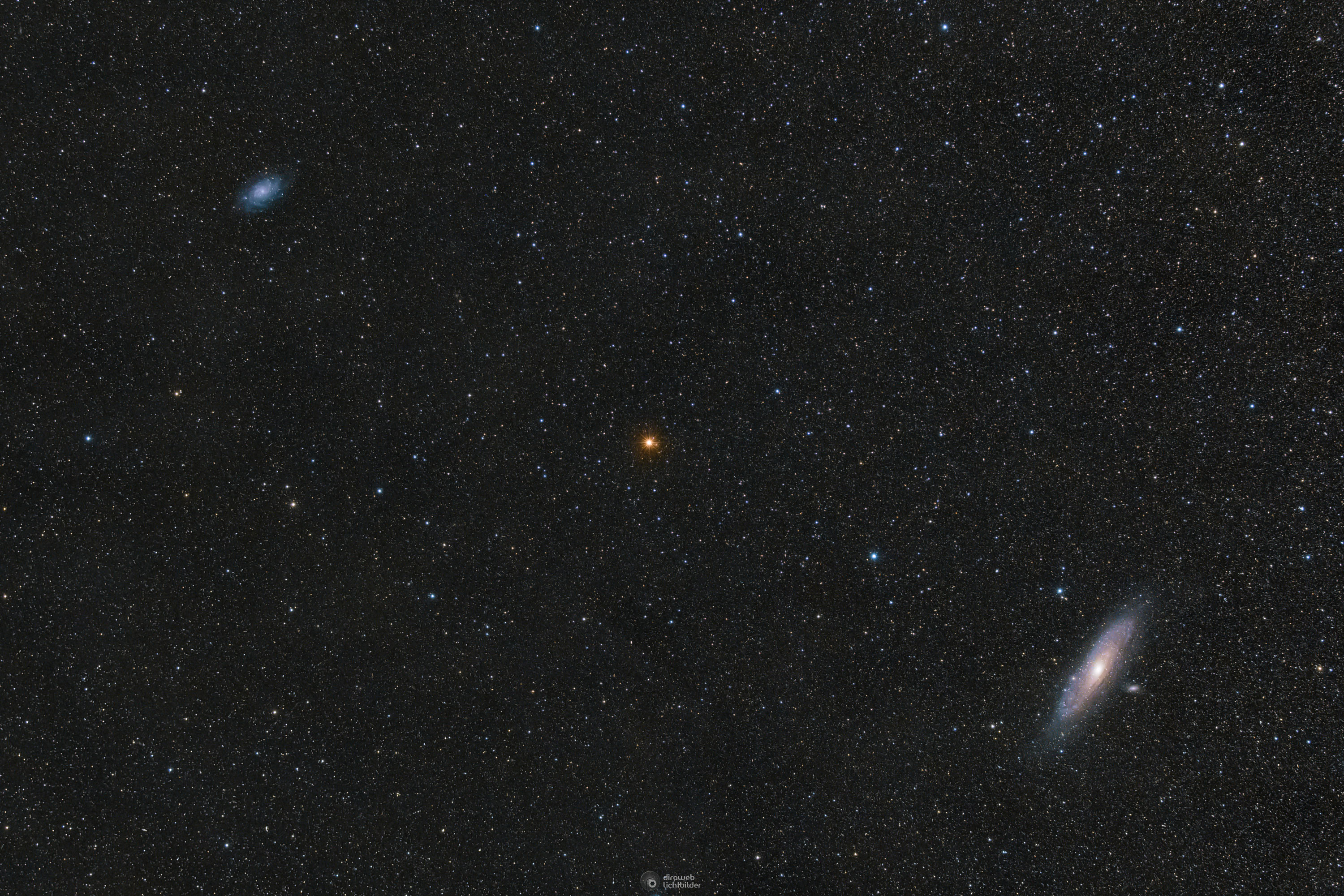 M 33, Dreiecksgalaxie und M31 Andromedagalaxie zusammen mit Stern Mirach. Beide Galaxien gehören zusammen mit unserer Milchstraße zur lokalen Gruppe. Sind also unsere direkten Nachbarn. Bei guter Sicht und relativ dunklem Himmel können beide schon mit dem bloßen Auge wahrgenommen werden. Zu finden in den gleichnamigen Sternzeichen Dreieck und Andromeda. Eigentlich wollte ich die Andromedagalaxie solo für einen Fotowettbewerb aufnehmen. Konnte mich aber nicht für eine Brennweite entscheiden und experimentierte deshalb etwas herum. Bei 70 mm passte dann auch noch die Dreiecksgalaxie mit aufs Bild. Was für ein Zufall. Zusammen mit dem roten Riesenstern Mirach ein nettes Trio, dachte ich und belichtete gut eine Stunde.