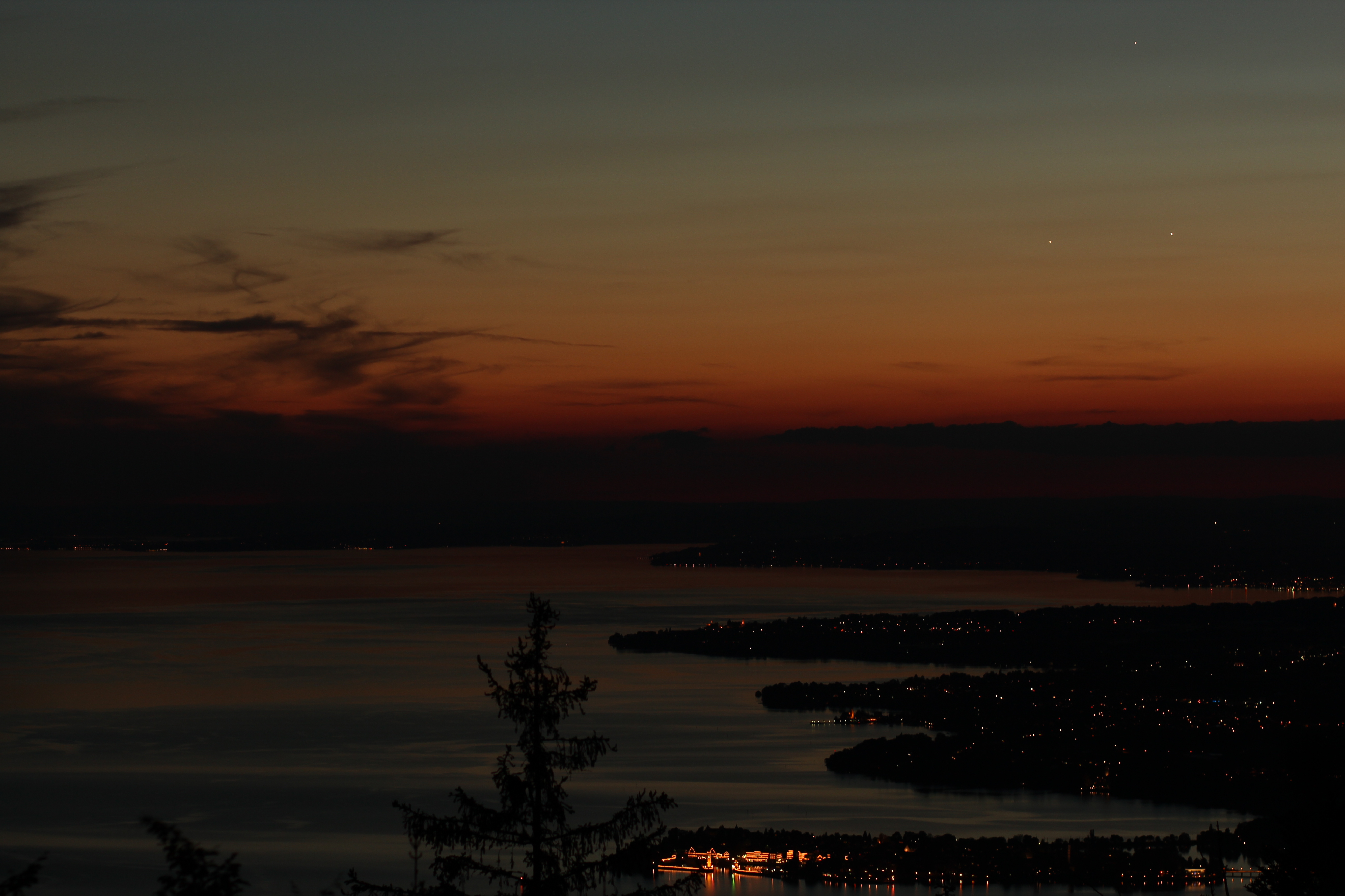 Ein kurzes Zwischenhoch bescherte uns einen klaren Himmel und so konnte ich die schöne Planetenkonstellation am Abendhimmel über dem Bodensee aufnehmen. Als Aufnahmeort bot sich der östlich des Sees gelegene Pfänder (1064 m üNN) in Vorarlberg/Österreich an. Der Küstenabschnitt auf der rechten Seite befindet sich in Deutschland, der hell erleuchtete Bereich direkt am unteren Bildrand ist die Hafeneinfahrt zur Lindauer Insel. Die abgelegene Küste hingegen befindet sich in der Schweiz. Zusammen mit den Bäumen im Vordergrund, welche auf österreichischem Boden stehen, vereint das Bild neben drei Planeten auch drei Länder.