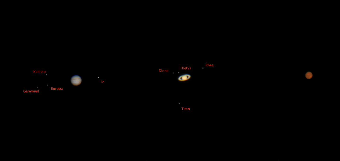 Ich habe in der selben Nacht Jupiter, Saturn und Mars mit identer Optik aufgenommen und in einer Collage nebeneinander gestellt, um die scheinbare Größe zu dokumentieren.