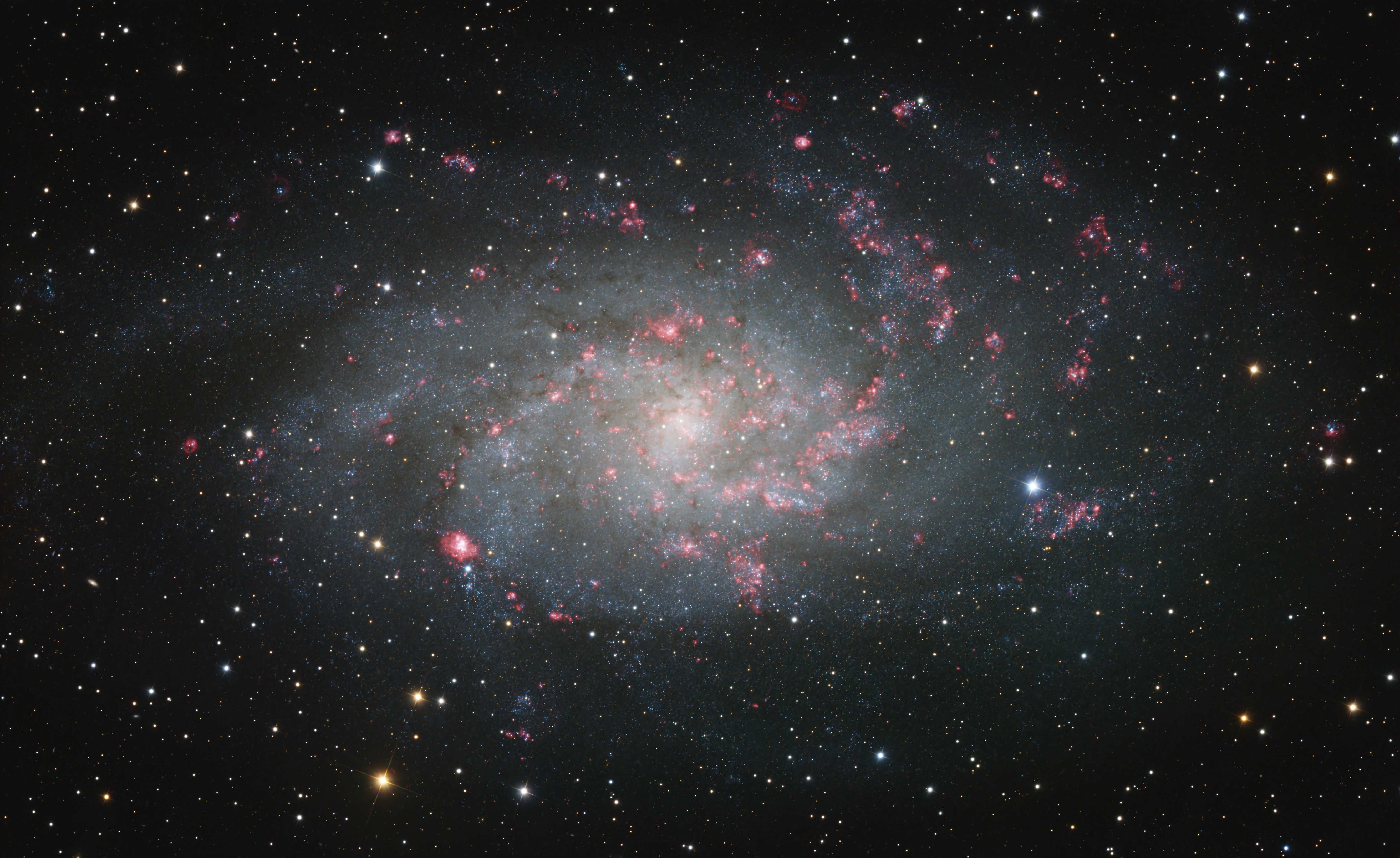Leider gab es im November 2024 nur wenige klare Nächte ohne störenden Mond. Ich wollte unbedingt die Galaxie M33 in Farbe aufnehmen und zusätzlich mit einem H-alpha-Schmalbandfilter die H-alpha-Regionen abbilden. Somit habe ich es in zwei Nächten geschafft immerhin knapp 7 Stunden Belichtungszeit zusammen zu bekommen.