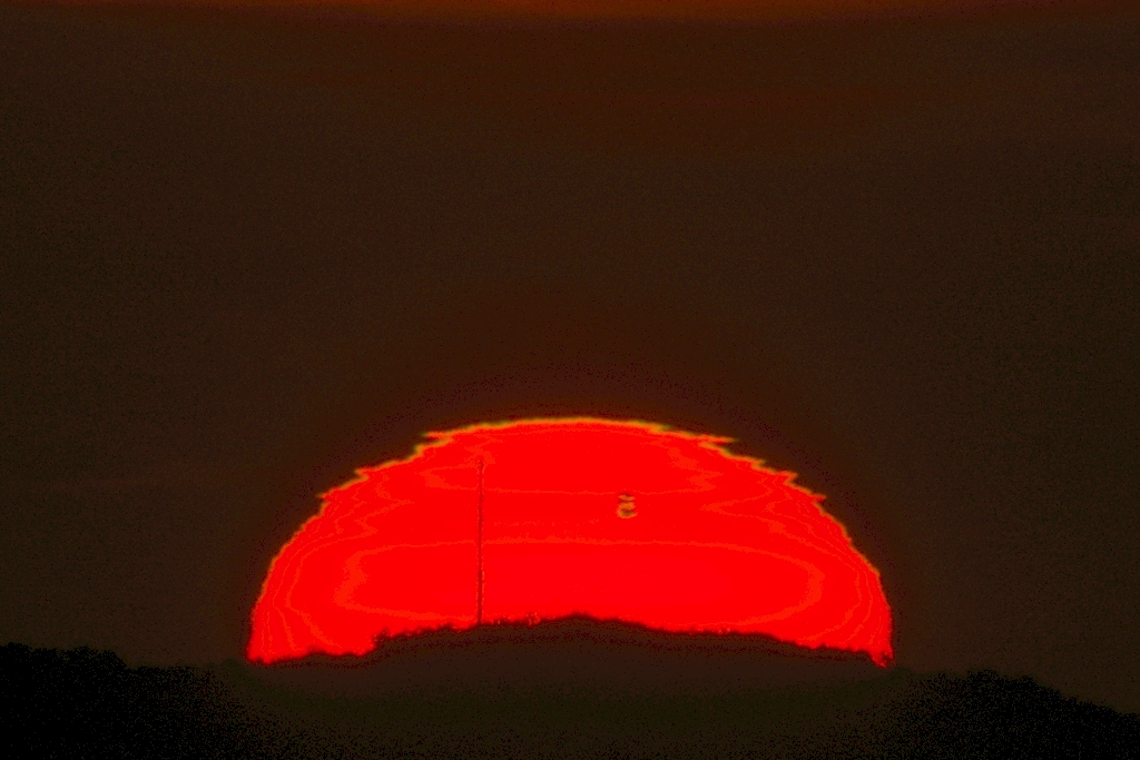 Ich beobachtete den Sonnenaufgang zum Venustransit über dem Dresdner Elbtal von der "Babisnauer Pappel" aus. Dabei waren viele Verzerrungseffekte durch die spezielle Luftschichtung bzw. atmosphärische Refraktion zu beobachten, wie hier ein Dreifachbild der "schwarzen" Venus.