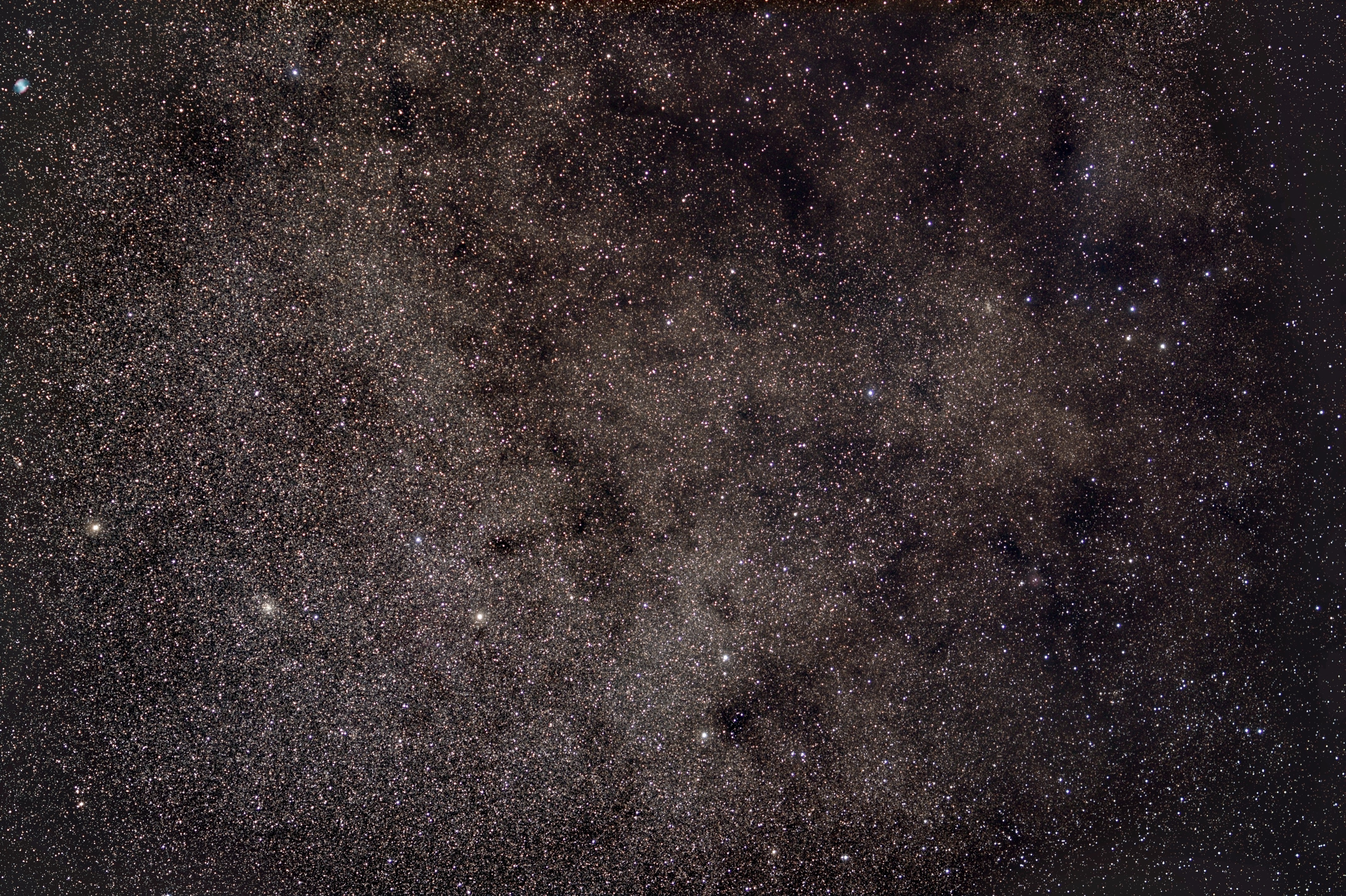 sich nur mit lang belichteten Fotografien erfassen. Dazu hier eine Aufnahme im Bereich der Sternbilder Fuchs und Pfeil. Links oben erkennt man noch den Hantelnebel Messier 27, im Sternbild Pfeil den Kugelsternhaufen Messier 71 und in der oberen rechten Bildhälfte die als Kleiderbügel bekannte Sterngruppe.
