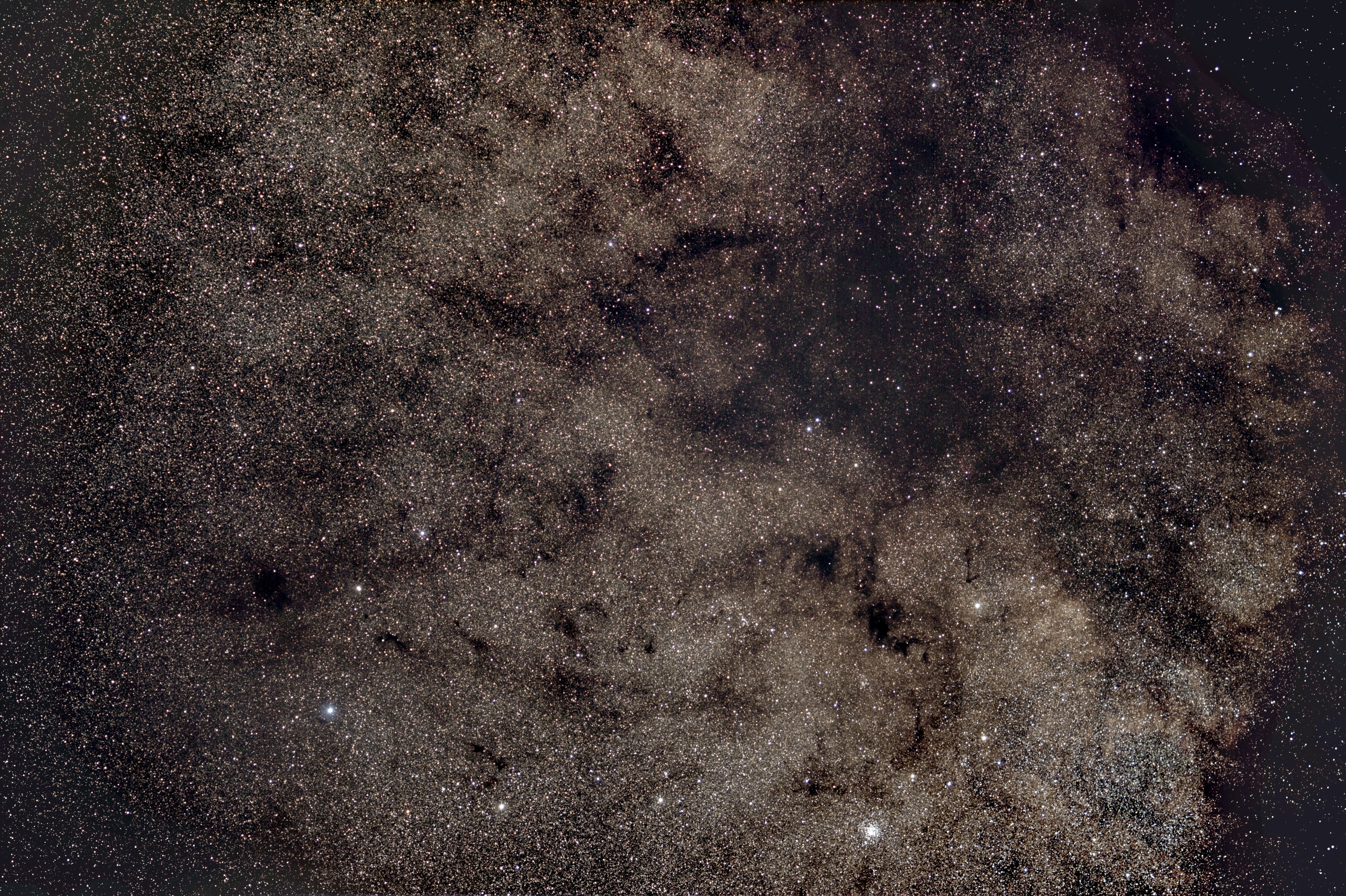 sich nur mit lang belichteten Aufnahmen erfassen. Dazu hier eine Aufnahme im Bereich der Sternbilder Adler und Schild. Am unteren Bildrand, rechts der Bildmitte der offene Sternhaufen Messier 11.