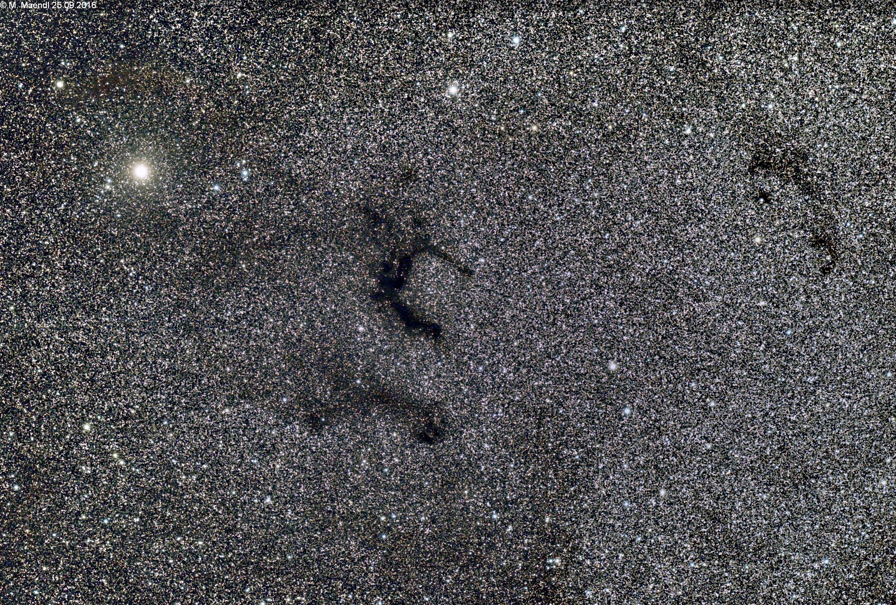 Der Dunkelnebel Barnard 143 im Sternbild Adler bildet zusammen mit dem darunterliegenden Barnard 142 den so genannten E-Nebel. Es handelt sich dabei um eine dunkle Staub- und Molekülgaswolke vor dem Sternengewirr der Milchstraße in einer Entfernung von etwa 2000 Lichtjahren. Der helle Stern links oben ist Tarazed im Kopf des Adlers.