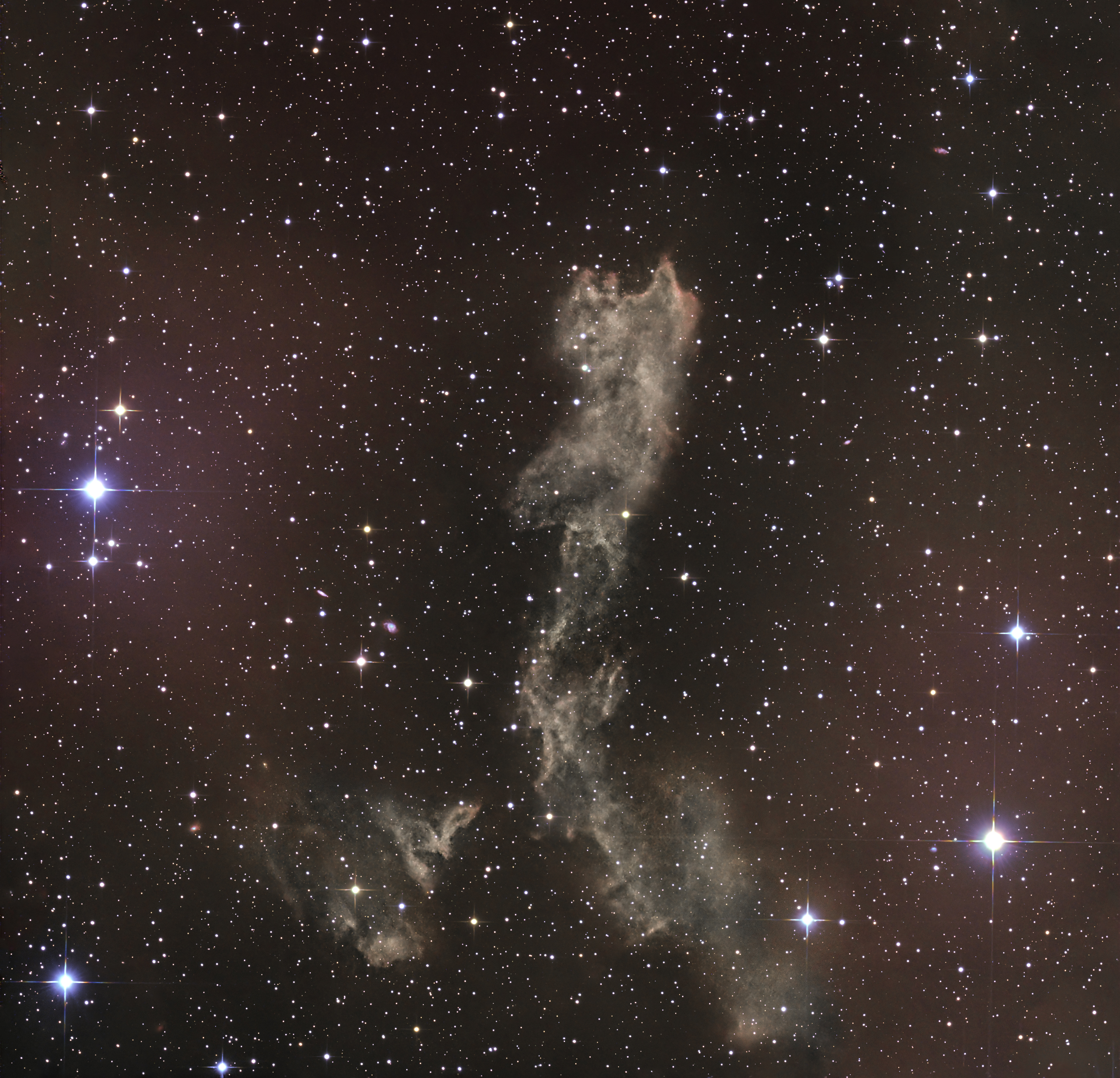 LBN 438 ist ein galaktischer Dunkelnebel in Sternbild Lacerta (Eidechse). Seine bräunliche Färbung entsteht durch von ihm reflektiertes Sternenlicht aus unserer Milchstraße. Bei der rötlichen Färbung des Hintergrunds dürfte es sich um durch Sterne zum Leuchten angeregten Wasserstoff handeln