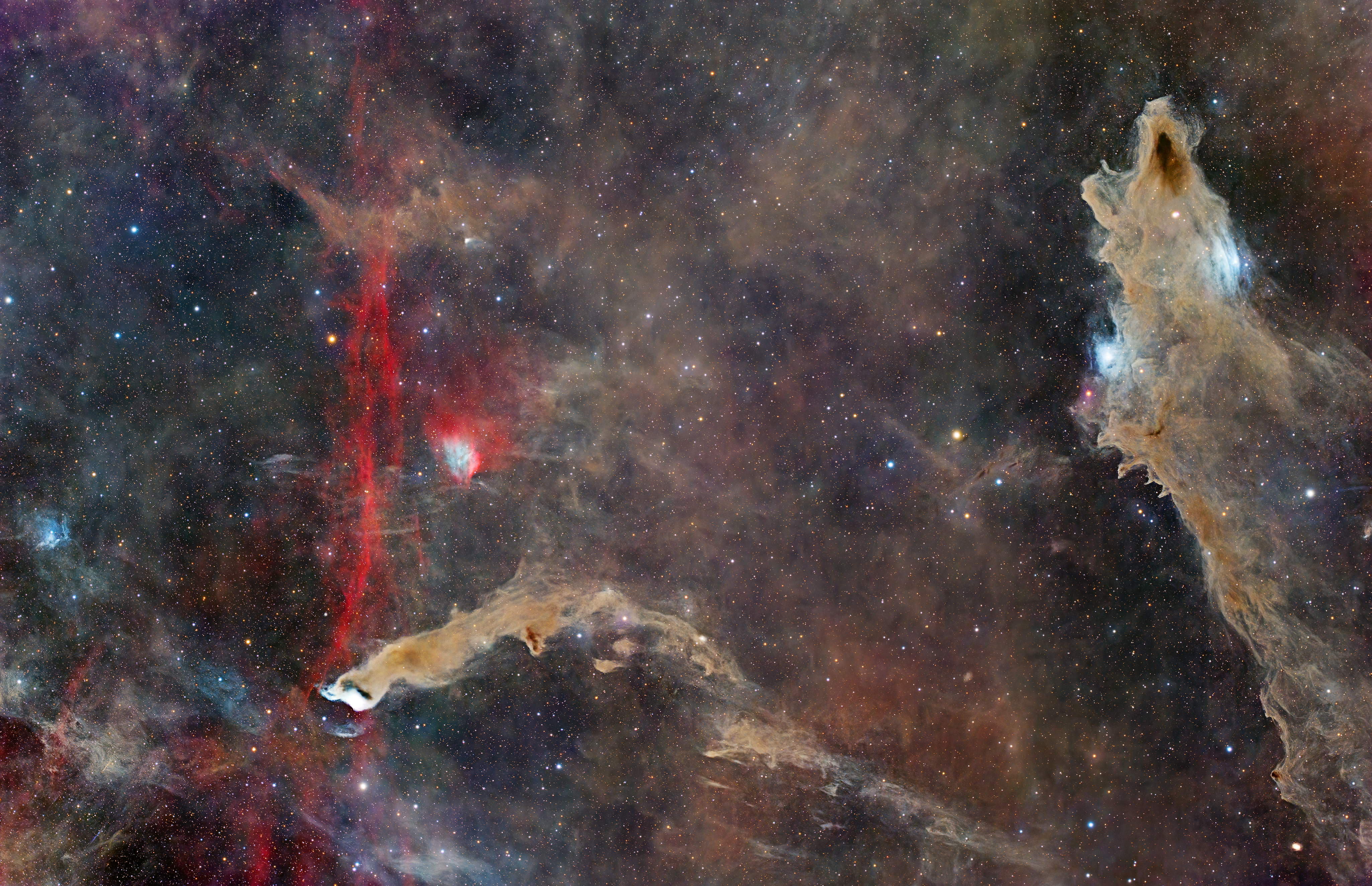 Der Dunkelnebel LDN 1235, auch als Dark Shark Nebula bekannt, ist Teil des Kepheus-Flare-Komplexes in rund 650 Lichtjahren Entfernung. Seine markante Form entsteht durch dichte Staubwolken, die das Licht der Milchstraße abschirmen. In die Struktur eingebettet leuchten die Reflexionsnebel vdB 149 und vdB 150 in einem bläulichen Schimmer, der durch nahe Sterne verursacht wird. Die Aufnahme zeigt darüber hinaus feine Strukturen des galaktischen Zirrus, die das Feld durchziehen, sowie rot leuchtende Filamente von ionisiertem Wasserstoff.