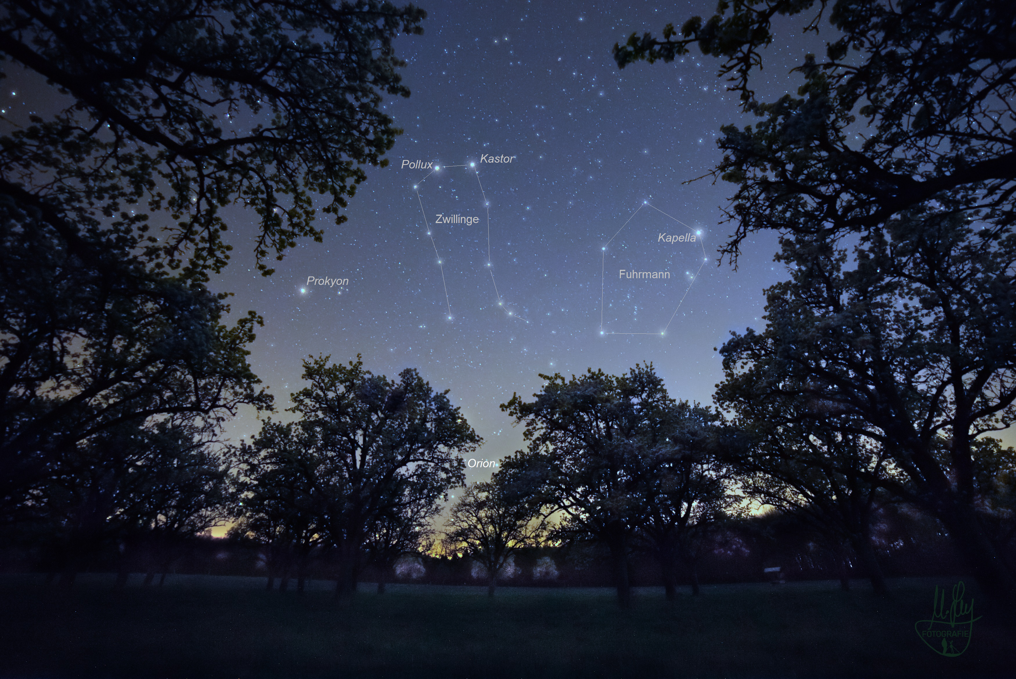 Wie ein Fenster zum All wirkt diese Baumlichtung. Inmitten einer blühenden Birnbaumplantage zeigt sich noch einmal der nördliche Teil des Wintersechseck. Der Blick geht Richtung Südwesthorizont. Die Hauptakteure am Himmel sind die Sternbilder Zwilling, Fuhrmann und der Kleine Hund mit seinem Hauptstern Prokyon. Teilweise durch Bäume verdeckt, ist der Himmelsjäger Orion schon zum Teil untergegangen.