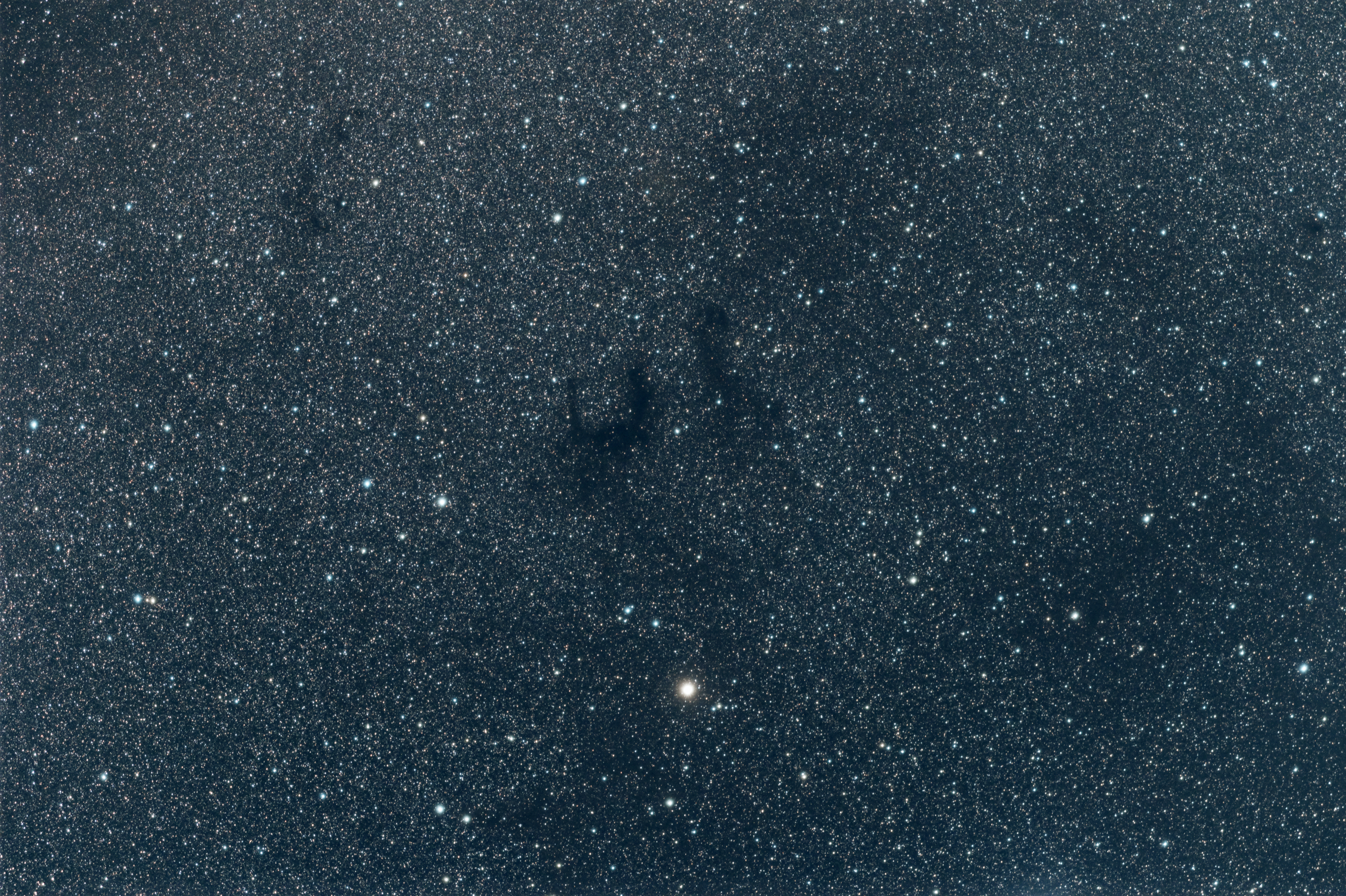 Der E-Benel unweit des Sterns Altair. Eine Dunkelwolke hebt sich vor der Milchstraße kontrastreich ab. Entfernung rund 2000 Lichtjahre.