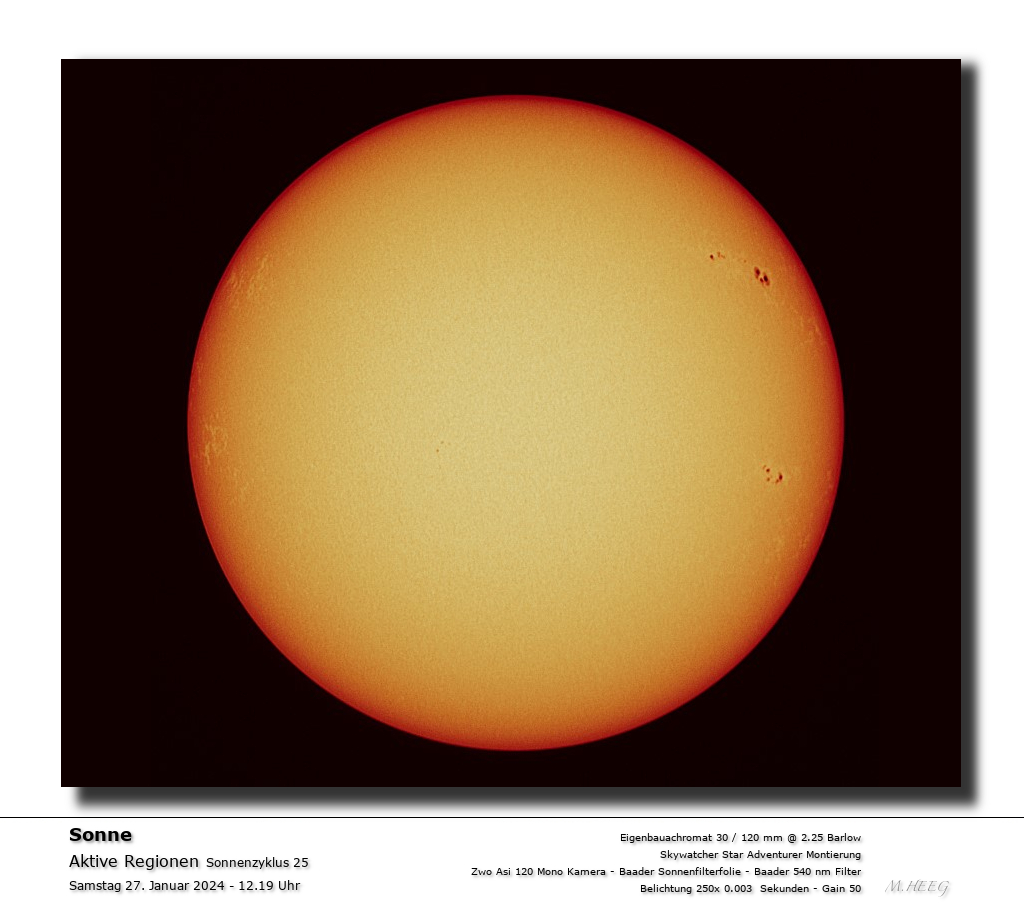 Hallo und Guten Tag an alle Sonnenbeobachter. Meine hier gezeigte Sonnenbeobachtung wurden mit extrem kleiner Optik beobachtet. Wie zu sehen, bedeutet klein jedoch nicht gleichzeitig optisch schlecht. Eine Tatsache, welche oft in Internetforen keine Beachtung mehr findet. Ich selber denke es geht auch ohne teure Ausrüstung. Hierzu ist ein Blick auf die Bildunterschrift meiner Beobachtung bestimmt hilfreich ... Weniger ist oft mehr., ... zumindest für mich ! Meine Beobachtungsdarstellung zeigt, was ich darunter verstehe.