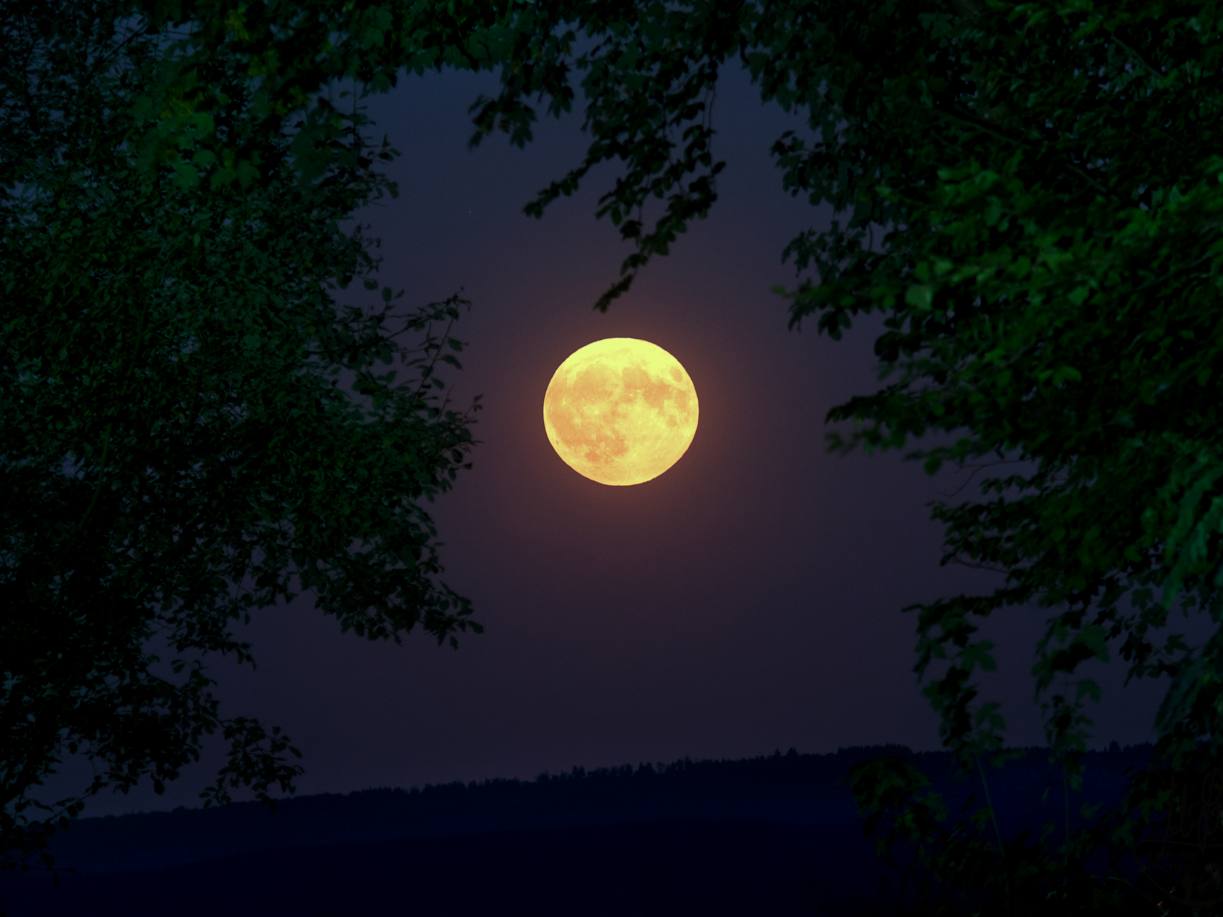 Kurz nach seinem Aufgang über einem klaren Osthorizont zeigt sich der August-Vollmond durch eine schmale Waldlichtung über dem Schimmelkopf im Naturpark Saar-Hunsrück. Zum Zeitpunkt der Aufnahme befand sich der Mond in seinem Perigäum, dem erdnahen Punkt des Mondorbits. Sein Abstand zur Erde betrug an diesem Abend rund 362000 km. Daher vergrößerte sich sein scheinbarer Durchmesser am Himmel. Er wird dann gerne als Supermond bezeichnet. Außerdem wird der Augustvollmond je nach Kulturkreis auch als Störmond, Wolfsmond, Fruchtmond oder Erntemond bezeichnet. Wie auch immer man ihn nennen möchte, es war ein überaus romantischer Mondaufgang und eine romantische Mondnacht und visuell, wunderschön anzusehen!