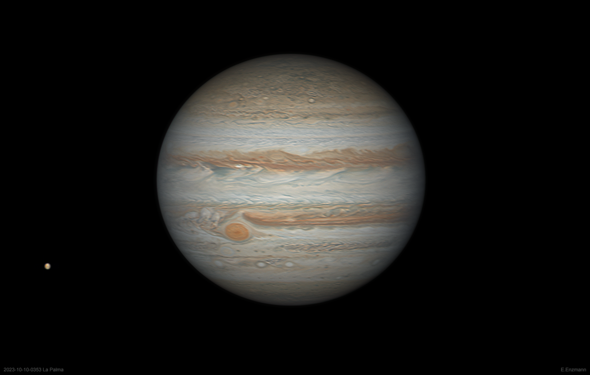 Hier ein weiteres detailreiches Bild vom Morgen des 10. Oktober 2023 aus La Palma. Wie schon beim ersten Bild, das hier veröffentlicht wurde, erwähnt, ist das Seeing im Laufe der Aufnahmeserie schlechter geworden. Auch wenn die Detailauflösung dieses Bildes nicht ganz an das erste Bild herankommt, ist es aufgrund des Mondes Europa und dem Großen Roten Fleck nicht minder interessant.